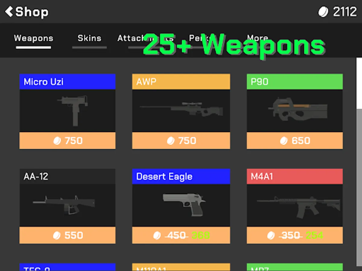 Weapons range from assault rifles, shotguns, snipers, submachine guns, and pistols that fall into three modes: full auto, semi auto, and three-round bursts. Weapons also can have attachments like a red dot sight, ACOG scope, or a suppressor. Skins like desert and snow camouflage are also available.