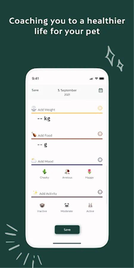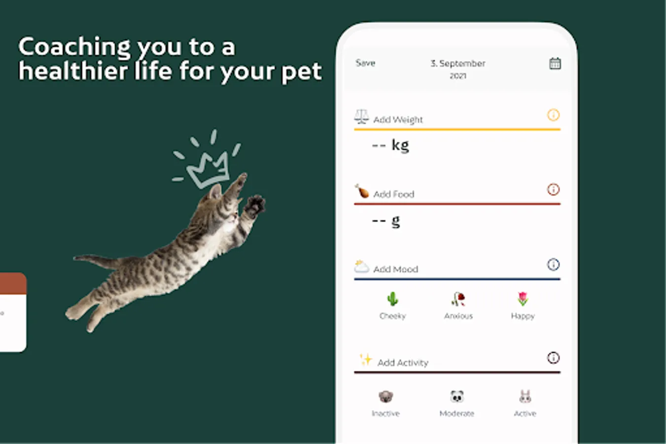 * Simplified tracking sheet: Tracking of weight, food intake, mood, and activity levels has never been easier. For food and weight tracking, you can enter a numerical value, and for mood and activity, you enter an emoji that represents what you predominantly perceived from your pet that day. Should you forget to track for that day, you can easily use our calendar to go backwards and enter information. All metrics are tracked on the same tracking sheet, and you have information boxes coaching you on the importance of each metric. Filling out the tracking sheet will not take more than a couple of minutes each day.