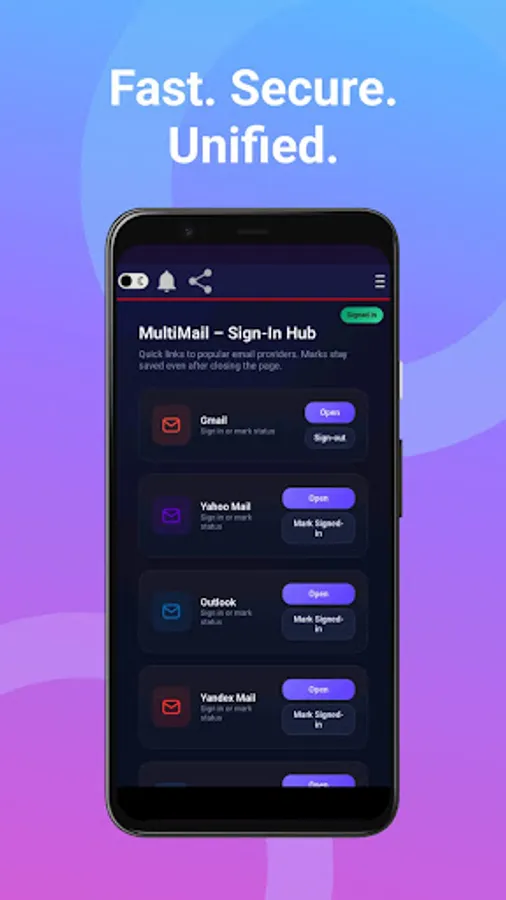 Tired of searching for different email apps? Get instant, one-tap access to all your favorite email providers including Gmail, Yahoo, Outlook and more, directly from a single, lightweight app!