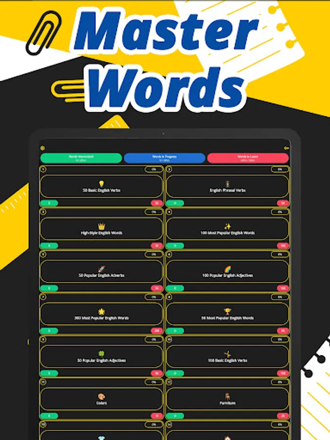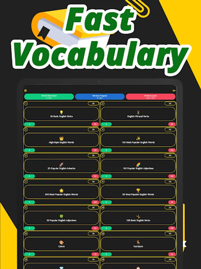 β’ Track Your Progress: With our intuitive dashboard, track words memorized, monitor words in progress, and list out new words every day that you aim to conquer. This personalized tracking helps you measure your improvement in real time.
