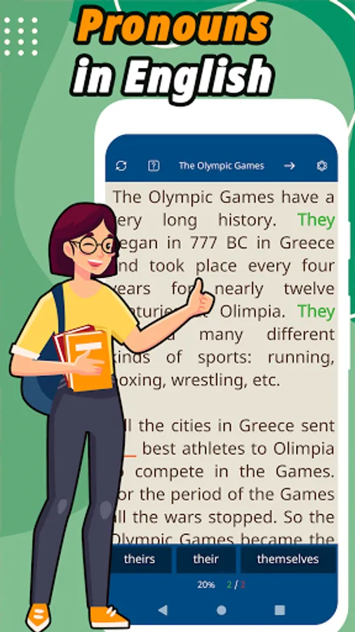 Our app contains a grammar reference for different types of pronouns. It will help you repeat certain pronouns, organize your knowledge, and for beginners to learn English to replenish their knowledge base.