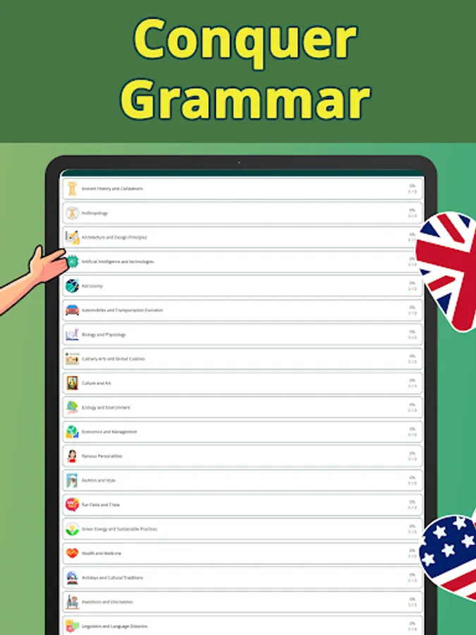 Step aside, mundane learning methods! Our app makes mastering American or British English not just educational but downright delightful. With tailored practices that boost your reading, enrich your vocabulary, and hone your language skills, you’re not just learning English—you’re enjoying it!