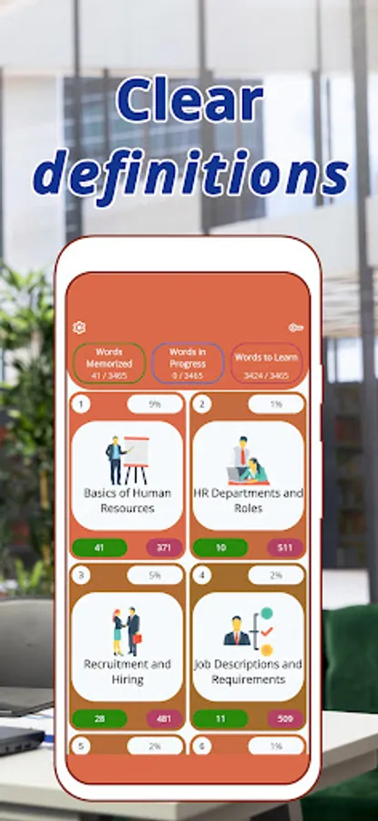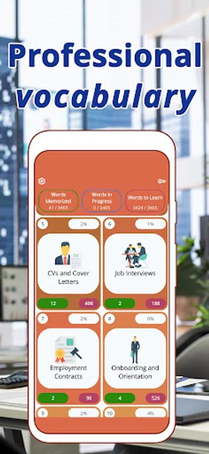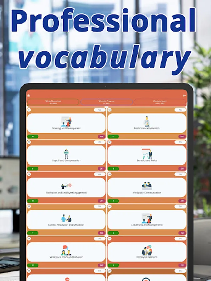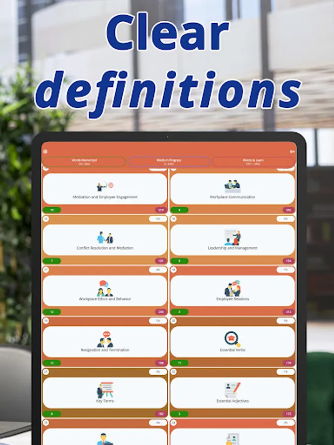 • Practical learning through flashcards designed for English for HR and workplace topics.
