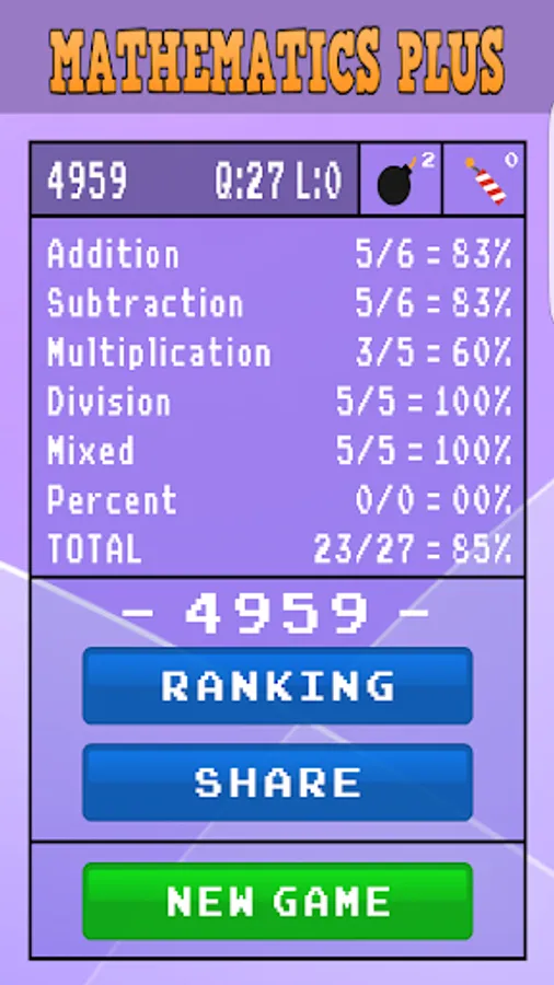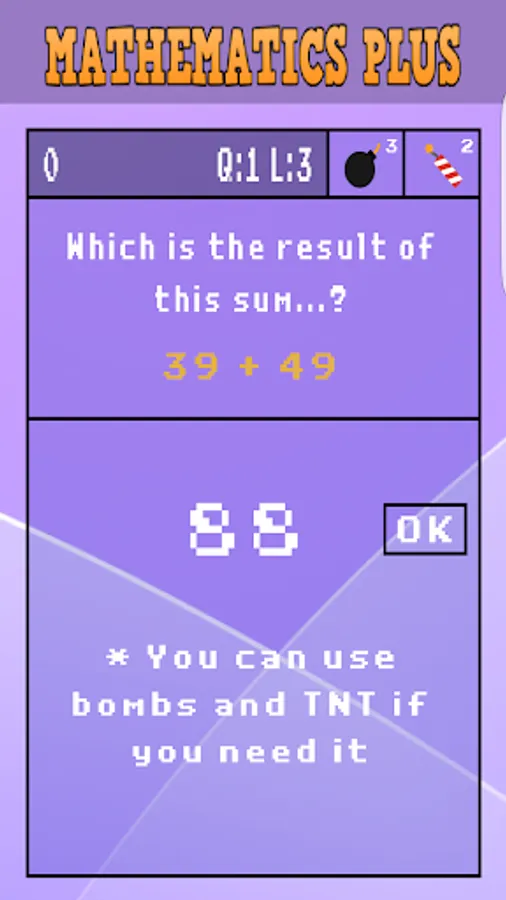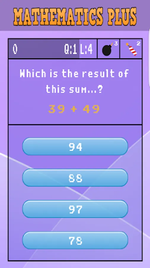 - Play: Get points by correctly answering questions about sums, substractions, multiplications, divisions and more. You have 4 lives, and once the game is over you can send your record to compare it with other Mathematics Plus players.