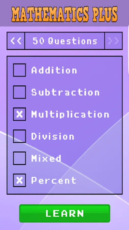 - Learn: You can select what kind of questions about math you want: sums, substractions, multiplications, divisions, mix and percents. For instance, if you want your children learn the multiplication tables choose level 'easy or medium' in the first screen, then clic 'LEARN' and then check only 'Multiplication'. It is a fun and easy way to learn the multiplication tables.