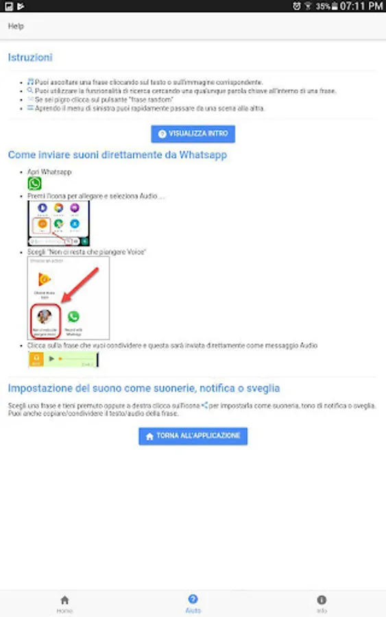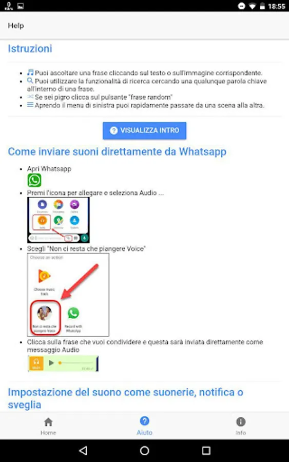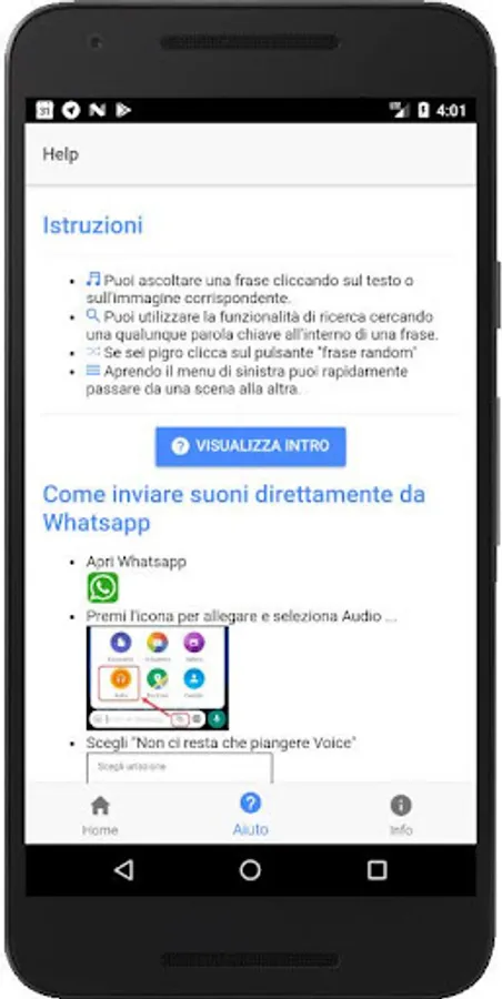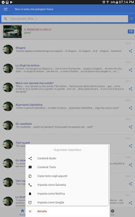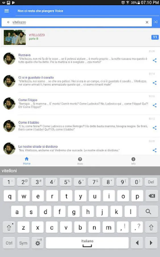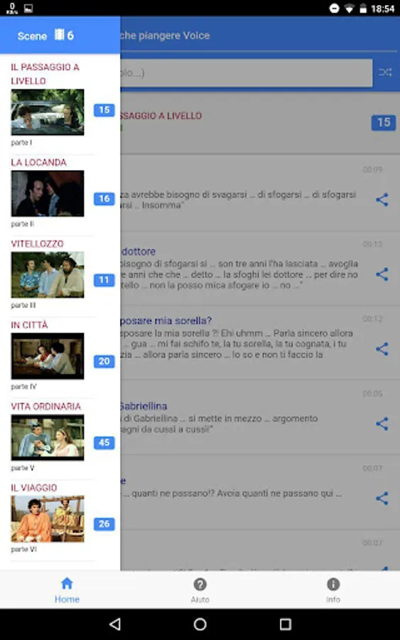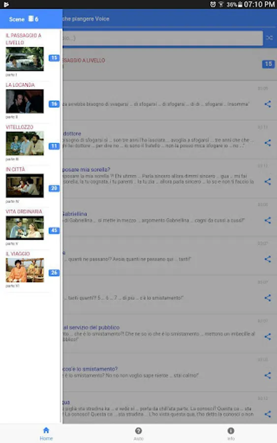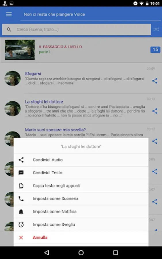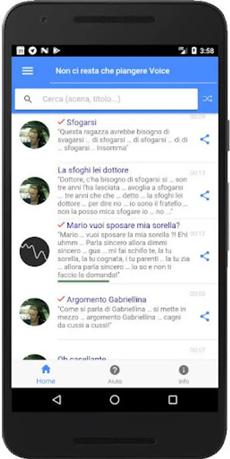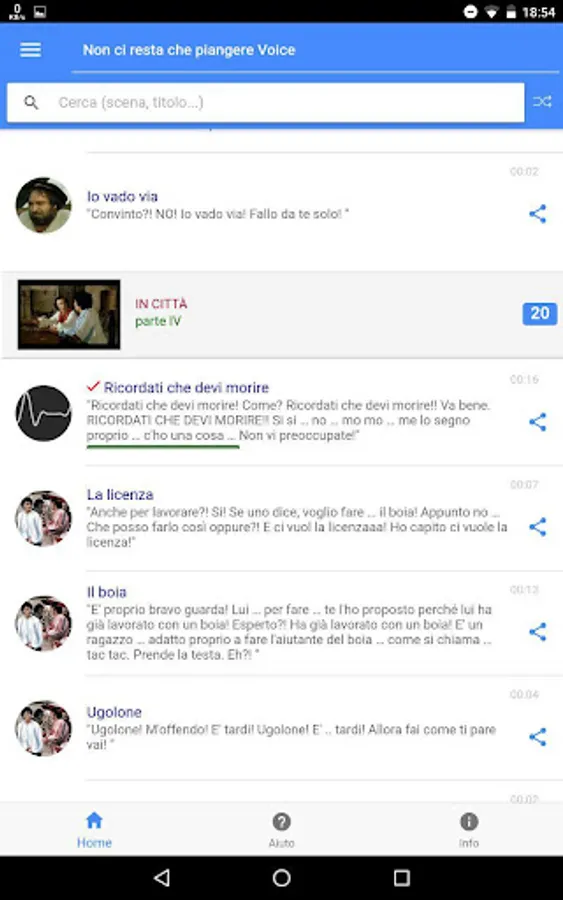 A selection divided by scenes with their most famous and funny phrases that you will listen and share directly from WhatsApp (Attach doing - Audio) or with any other application with the standard Android sharing feature.