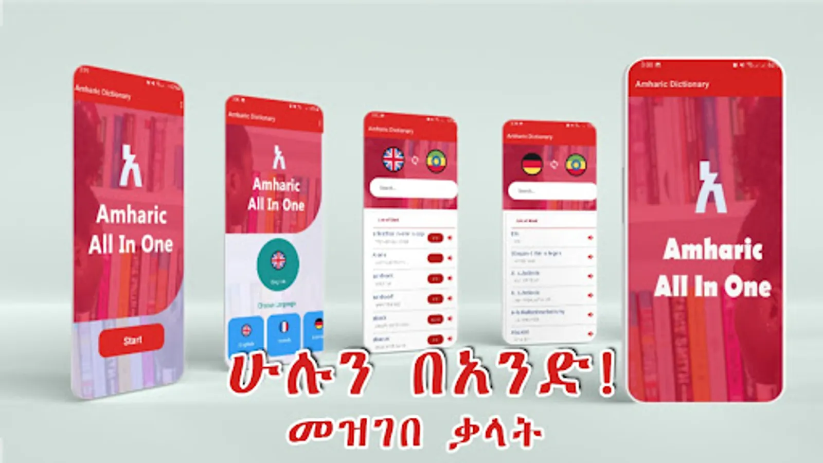 * The Amharic All in One Dictionary is an easy-to-use, portable and English to Amharic dictionary. It contains all the important English to Amharic translations in one single app.