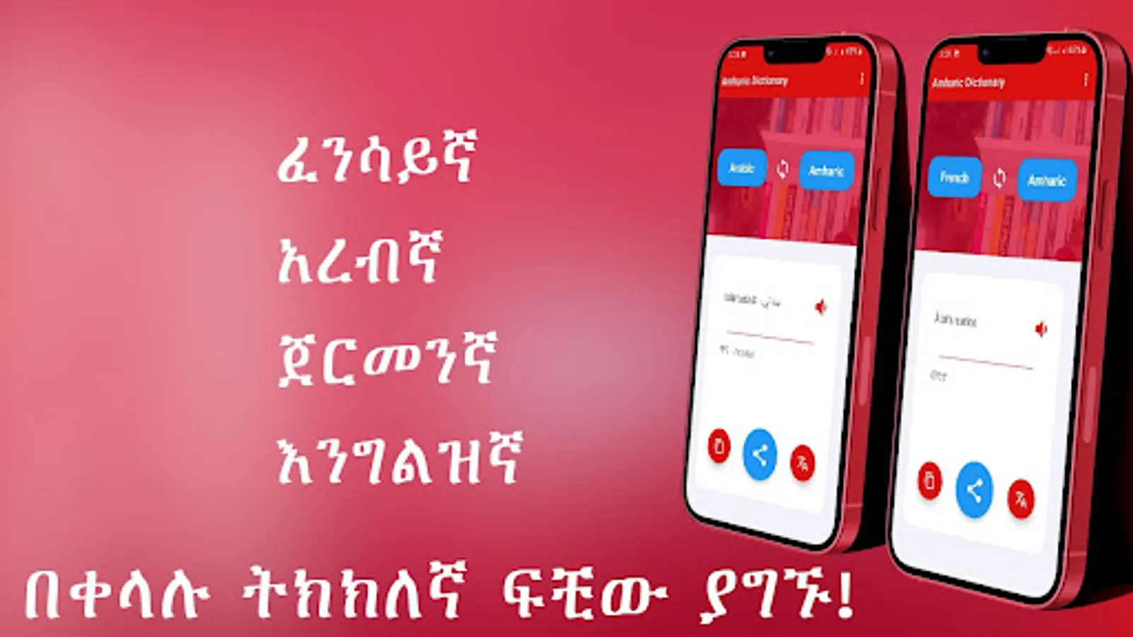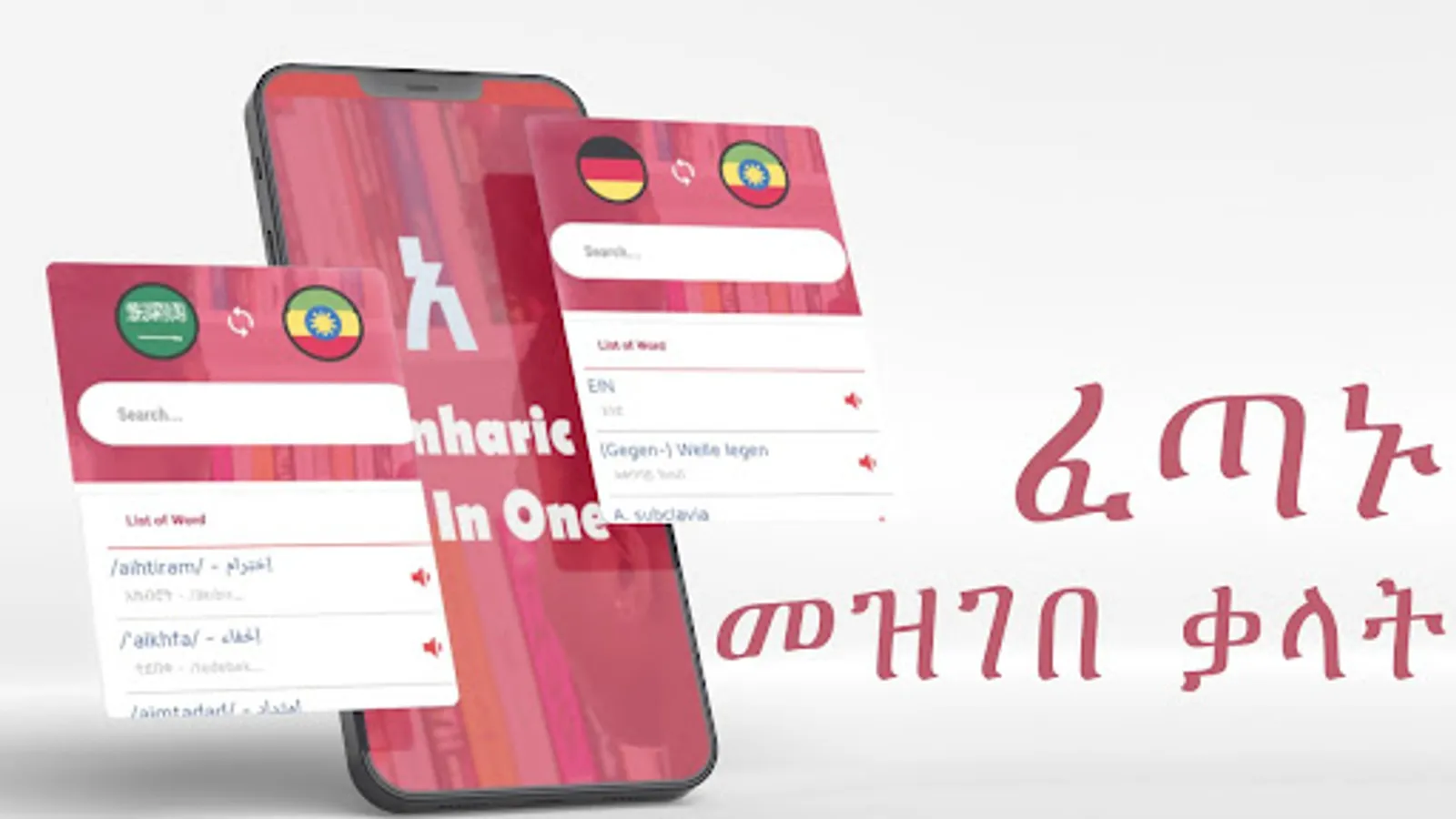 This special Amharic-English, Amharic-German, Amharic-French, Amharic-Arabic, Amharic-Oromoo , and Amharic-Tigranya dictionary enables you to read and understand any text written in these languages.