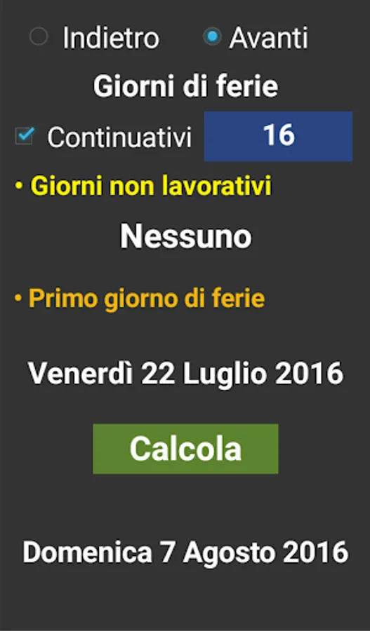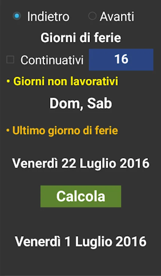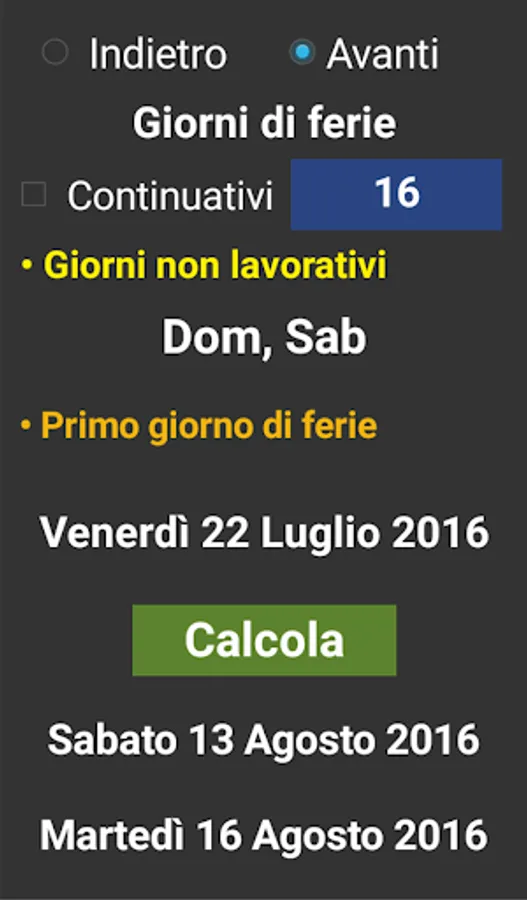 To change the reference date, long touch on the date; to select non-working days, long touch on them; to reset the data long touch on the calculated date.