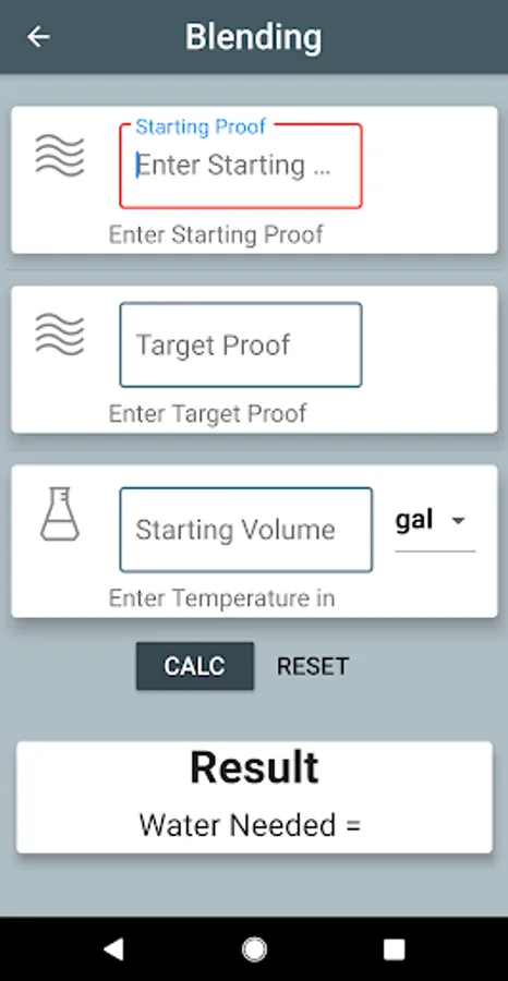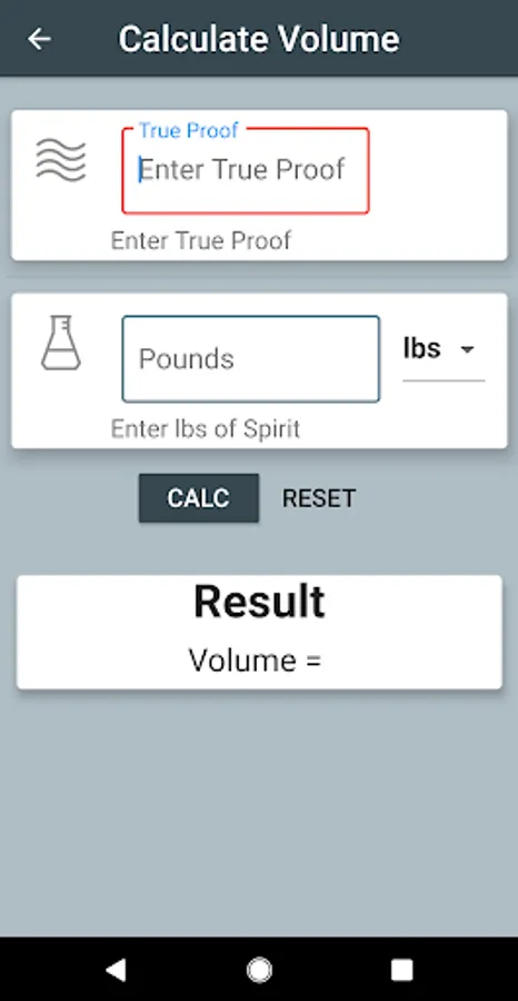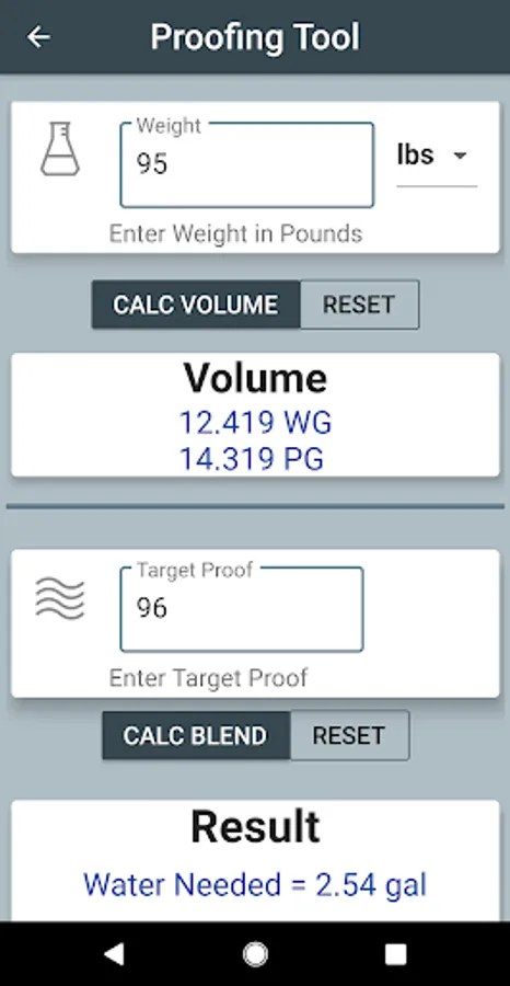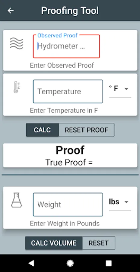 ALCulator provides tools that make it convenient for distillers to: correct hydrometer readings; calculate liquid volume of spirits given their proof and either the total weight of the spirits or the number of bottles filled; calculate the amount of water needed to reduce the proof of a distilled spirit to a lower proof. ALCulator also provides a Proofing Tool that combines correcting proof, calculating volume, and calculating water needed all in one easy to use screen.