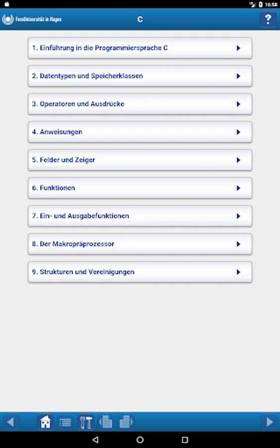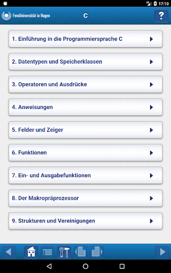 In the first chapter, in addition to the historical development, an overview of the basic features of the programming language C is given. It deals with the lexicon of the programming language and the structure of programs, generally referred to as functions in C.