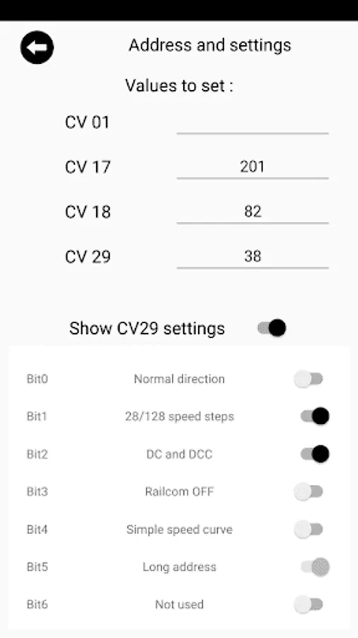 With this DCC Calculator you can quickly calculate the CV1, CV17 and CV18 for short and long address. You can also calculate CV29 and other CV with 8 bits options