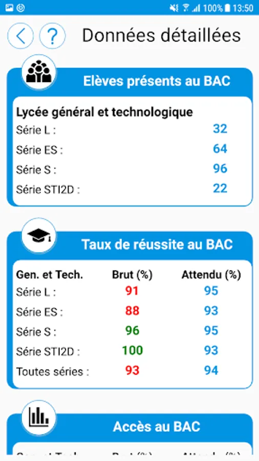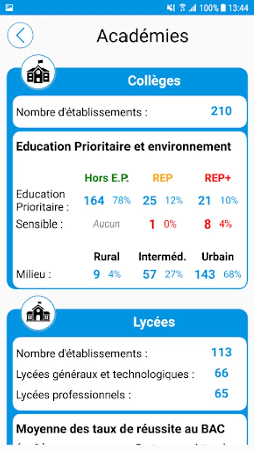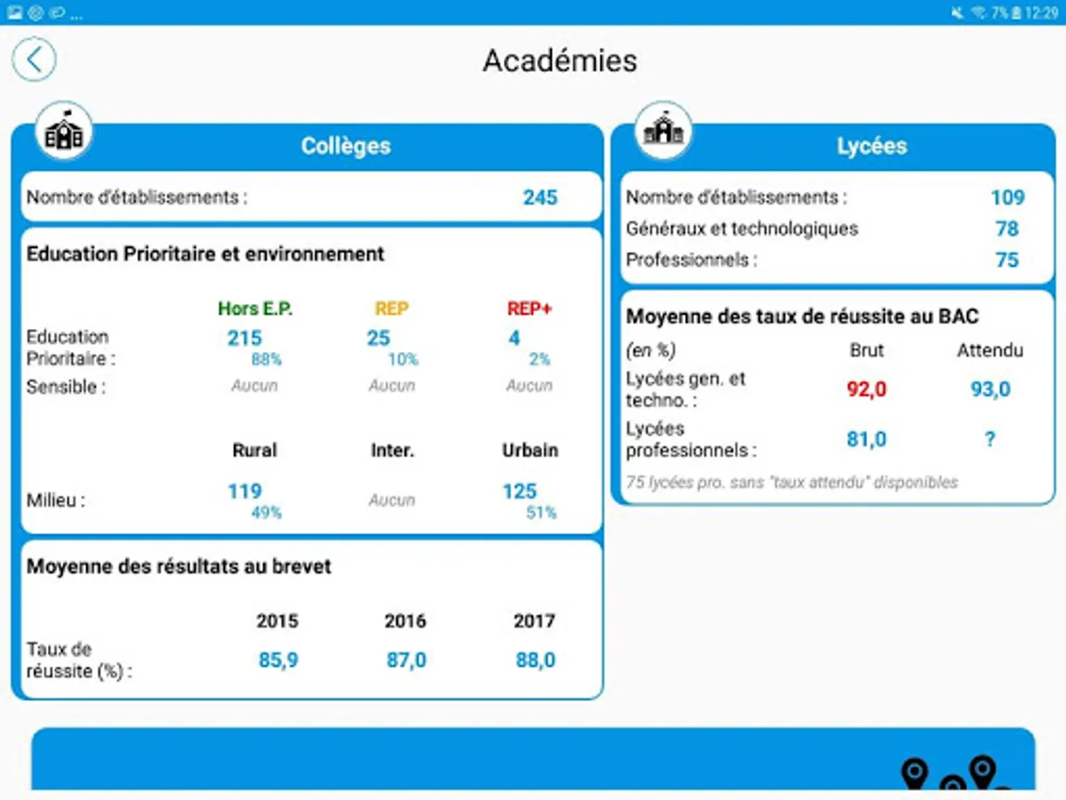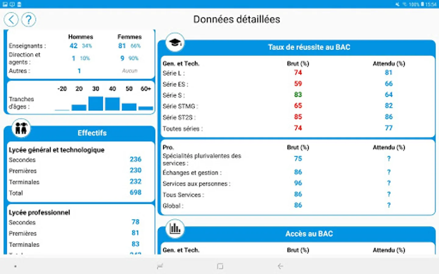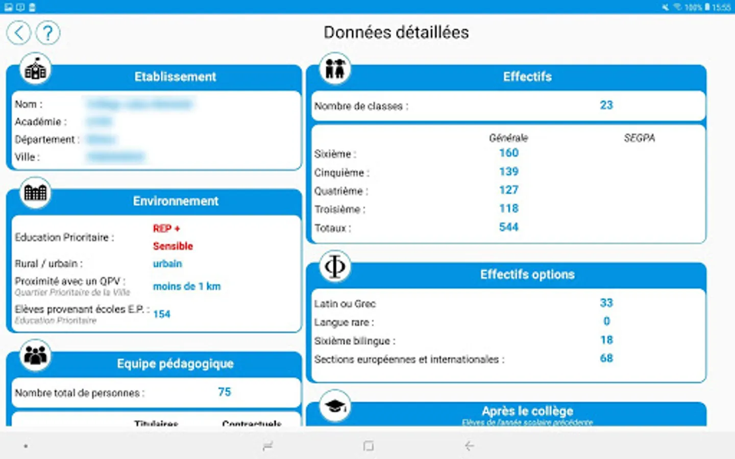• Consult the statistics of each establishment (numbers, classes, sections, Brevet / BAC success rate, Priority Education ranking, etc.)
