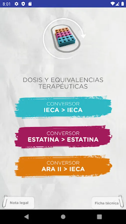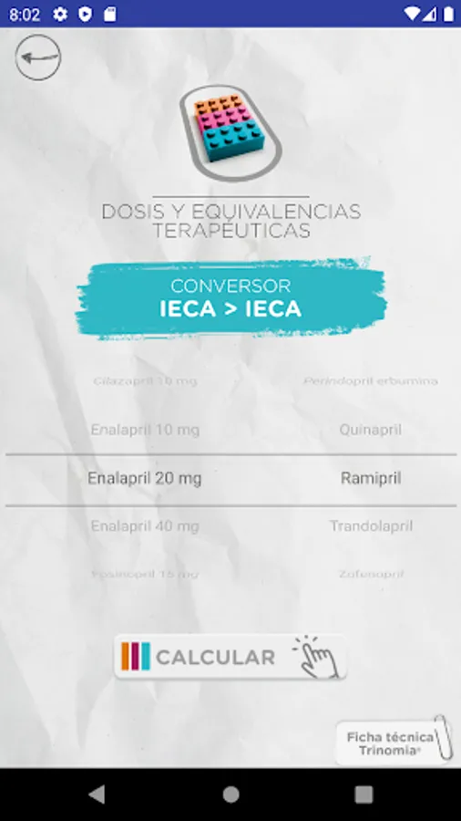 The CARDIOEQUIVALENCIAS calculator is an application developed by Ferrer Internacional, S.A., whose objective is to help health professionals to know the approximate equivalent doses of some ACEIs, ARAS and statins available on the market vs. other salts of the therapeutic group, favoring therapeutic exchange of active ingredients for the management of cardiovascular health.