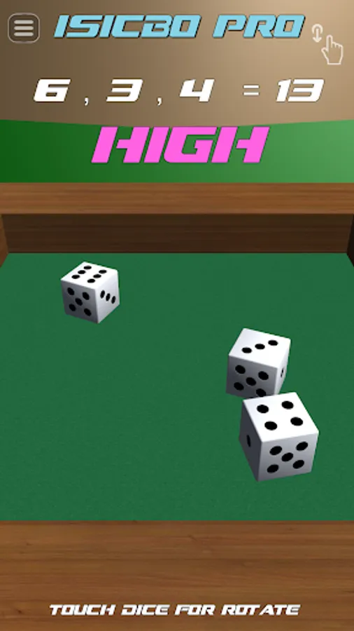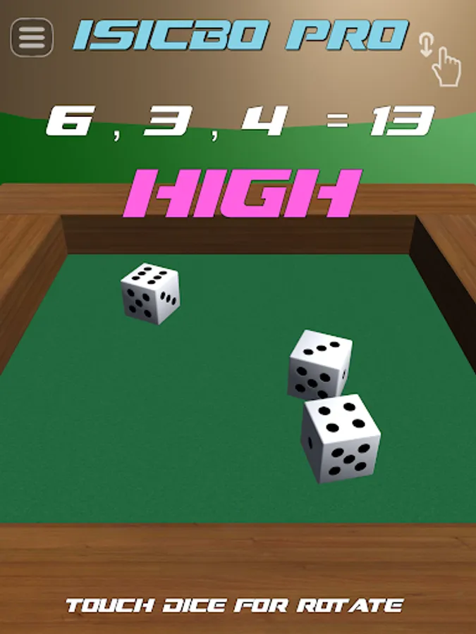 Sic bo (骰寶), also known as tai sai (大細), dai siu (大小), big and small or hi-lo, is an unequal game of chance played with three dice, and of ancient Chinese origin. Grand hazard and chuck-a-luck are variants, and of English origin. The literal meaning of sic bo is "precious dice", while dai siu and dai sai mean "big [or] small".Let's turn your device into Sic bo casino. Play with your friends and enjoy new exciting experience.
