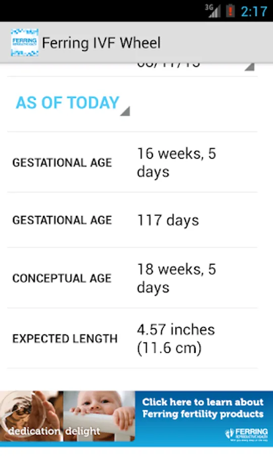 Ferring IVF Wheel is the only pregnancy wheel (gestational calculator) designed for IVF (in vitro fertilization) calculations and management. If you’re an REI (reproductive endocrinology and infertility) physician or nurse, it’s more than just a replacement for your trusty paper wheel: it’s simple, convenient, and fast, and it provides useful additional information.