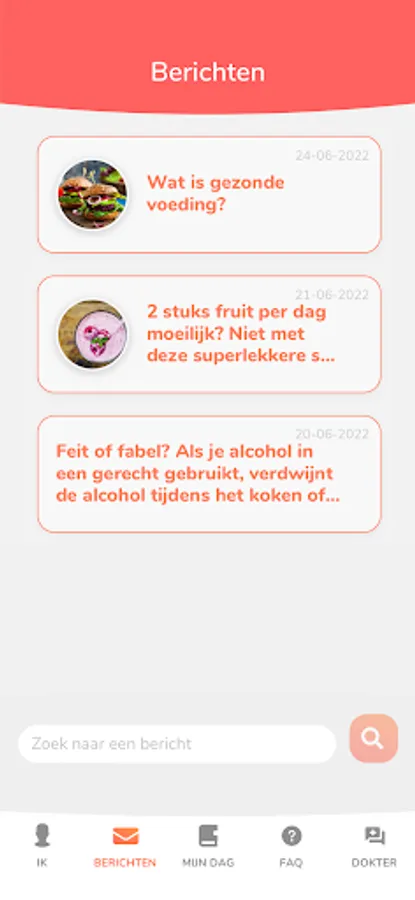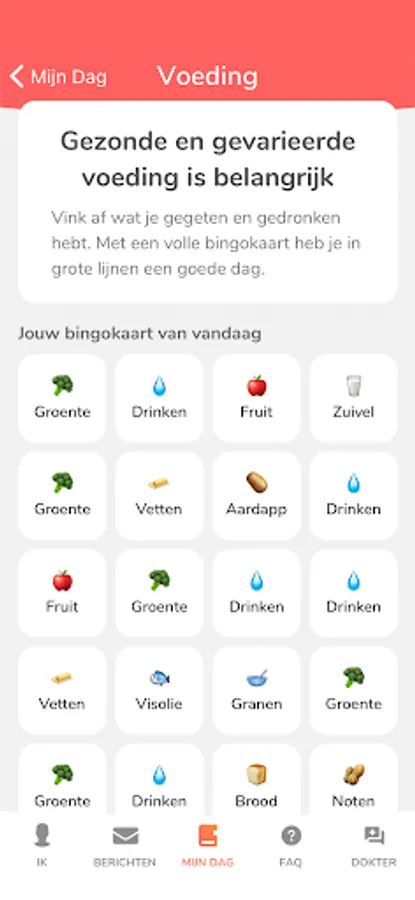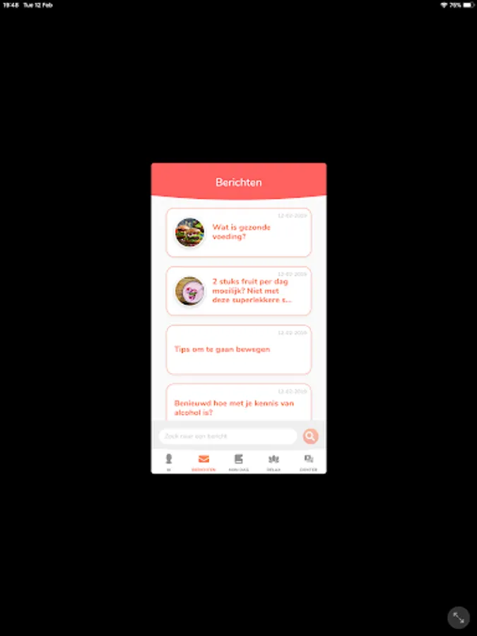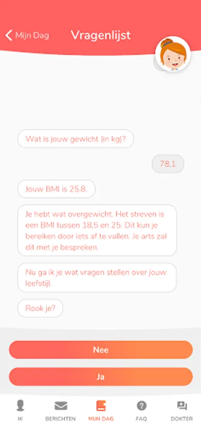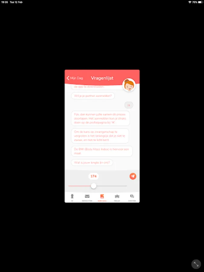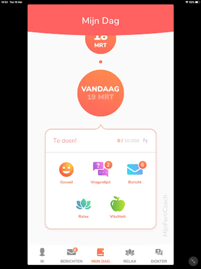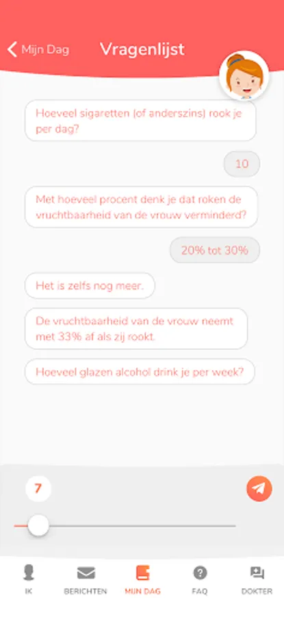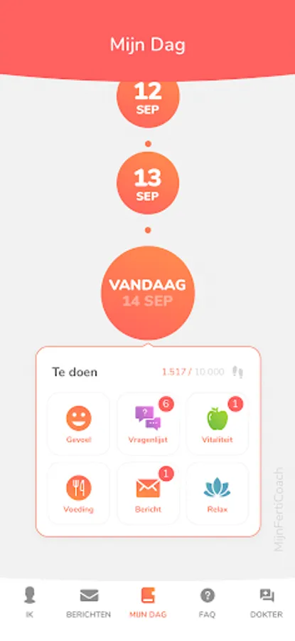 MijnFertiCoach is a personal online lifestyle coach that motivates, informs and supports for months. This app is part of a program that is offered to you from the hospital. The process starts with an extensive questionnaire that you receive before the first appointment with your doctor. You can then indicate whether your partner may participate in the coaching process and he or she will also receive a questionnaire. These questionnaires are important for the doctor to be able to determine the correct counseling process.