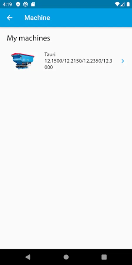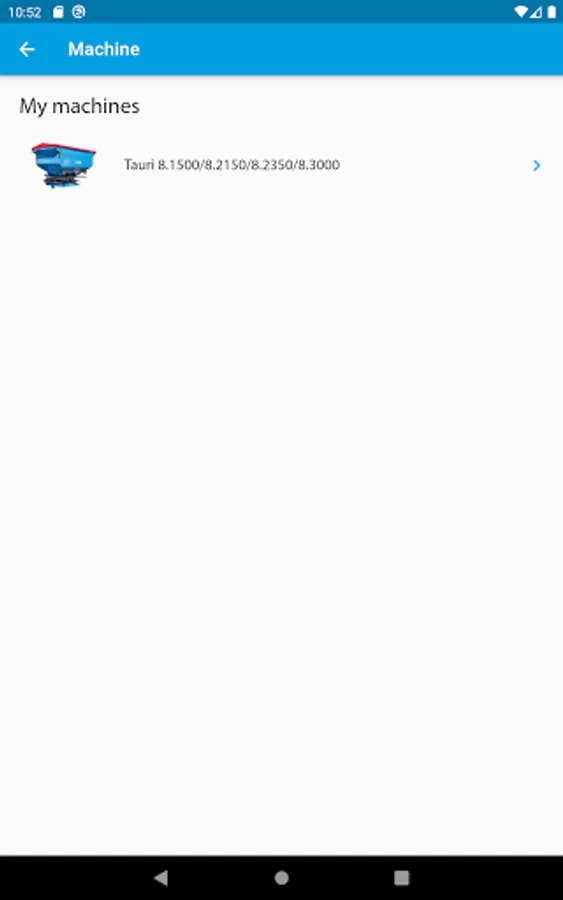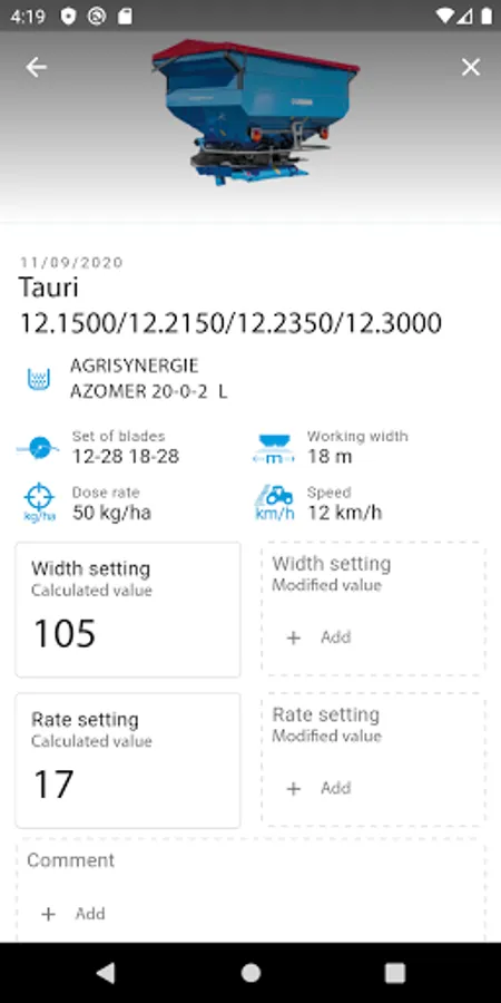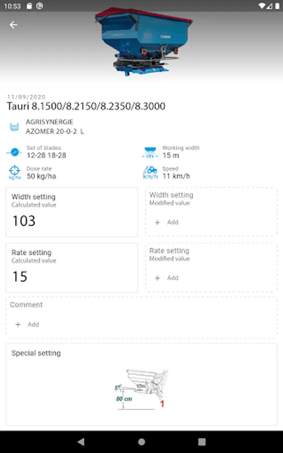 3. selecting the fertiliser spreader model and entering the type of throwing vane, working width, forward speed and the distribution rate