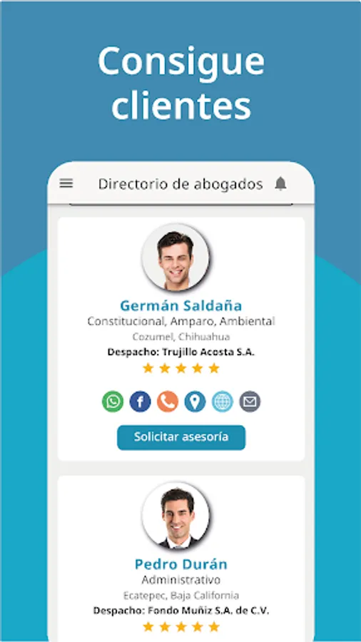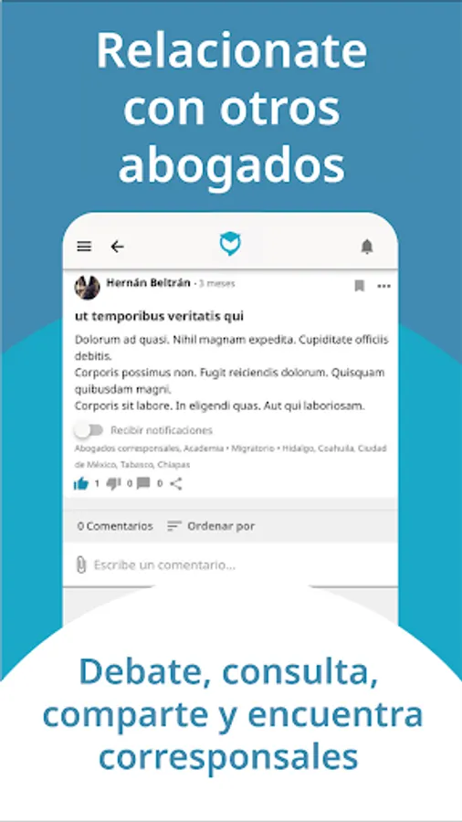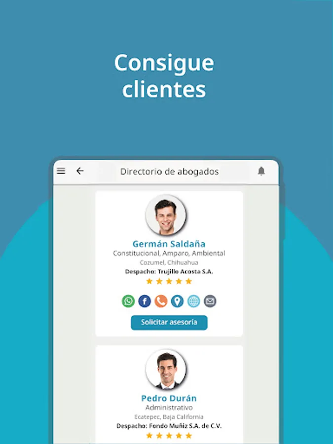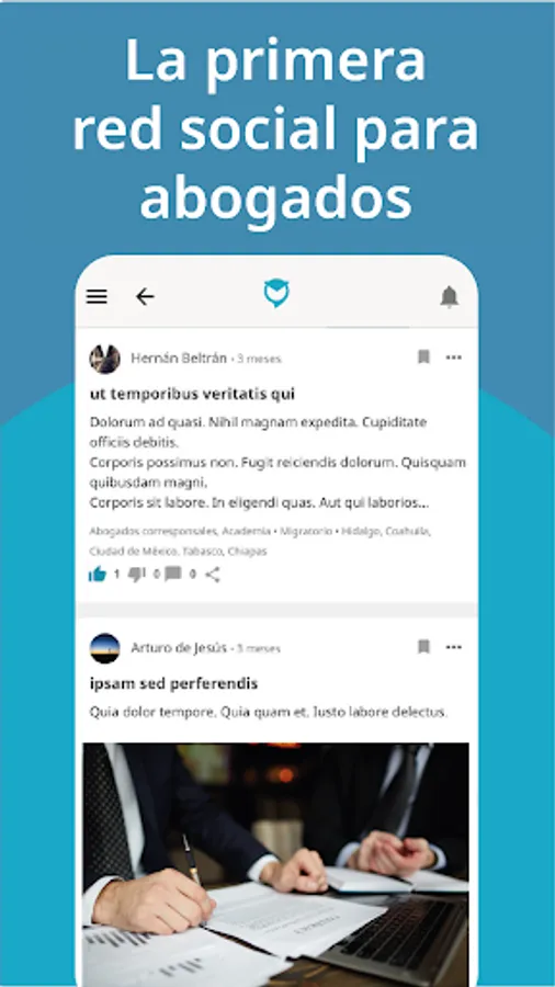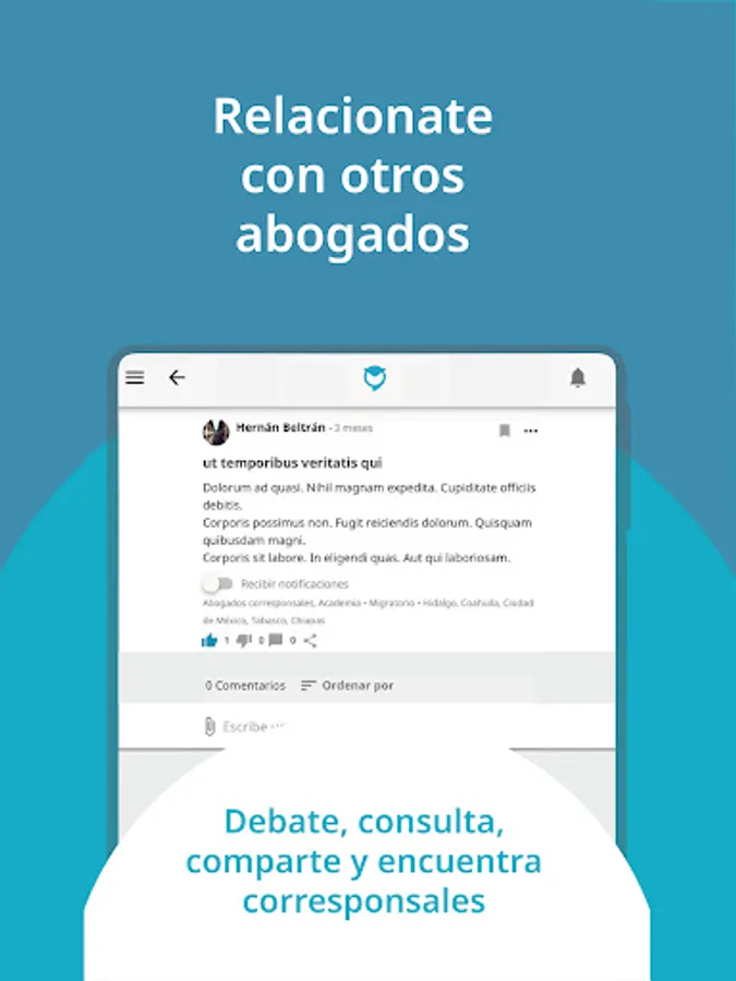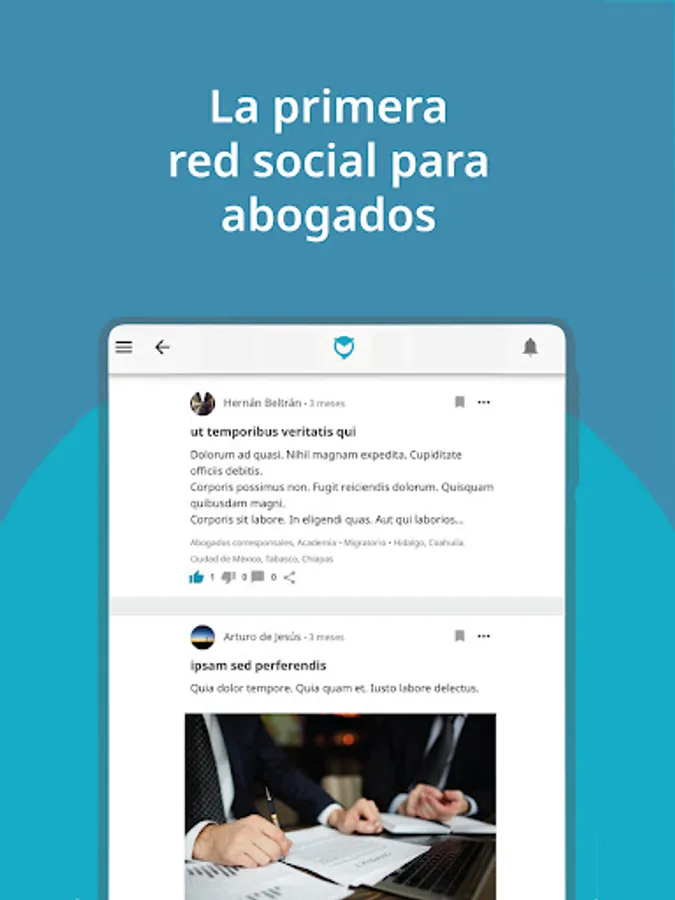 Welcome to the best community of lawyers in Mexico. The first social network made by and for lawyers. Where you can interact with colleagues from all over the country, share information, find correspondent lawyers, and even get clients through our directory and online consultations.