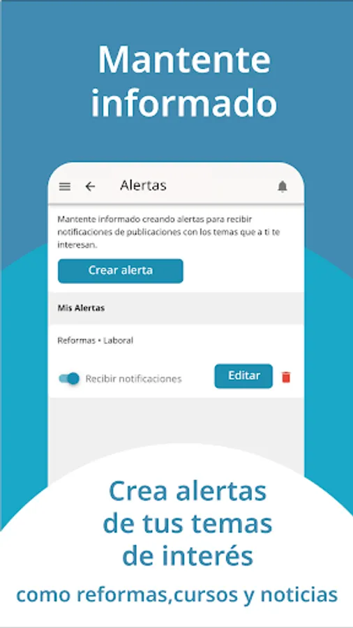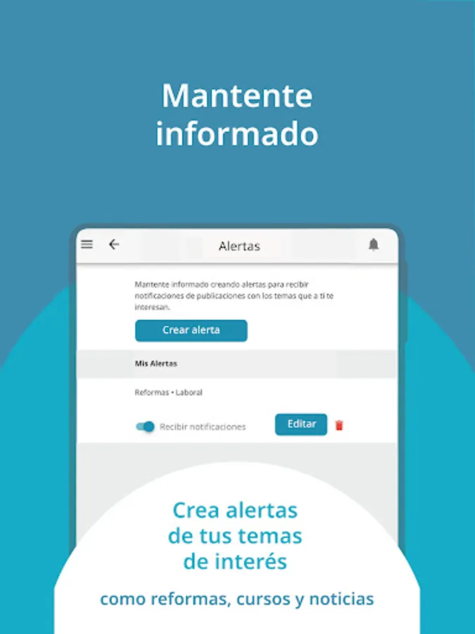 Stay informed by creating alerts, so that you receive notifications every time a publication is created on the topics that interest you. For example, reforms or news on a certain subject. With which, you will always be up to date on the latest events in the world of law.