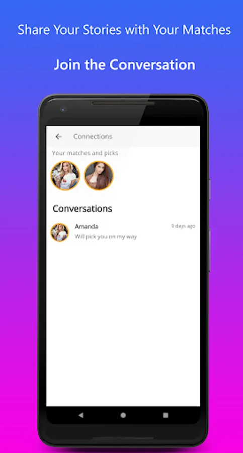 • Chat with your matches and share with confidence. Your shared images, videos and messages get deleted automatically after some time. Or you can delete entire conversations or individual messages whenever you want and it gets deleted from all devices including the devices of other persons too.
