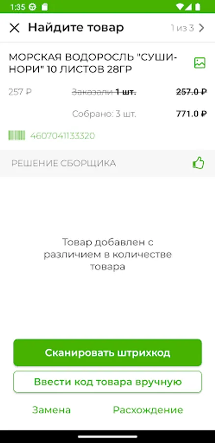 The main function of the application is the collection of orders. Using the application, the picker receives a list of orders to be collected. He can scan the items with his device's camera or manually enter the barcode to add the item to the order. The application automatically counts the number of items to be added to the order and displays this information on the screen.