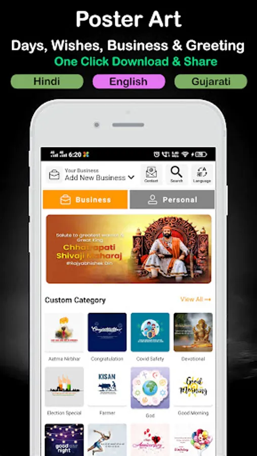 ❖Content available in 3+ Regional languages like Adbanao Hindi, Gujarati Poster, and English poster maker