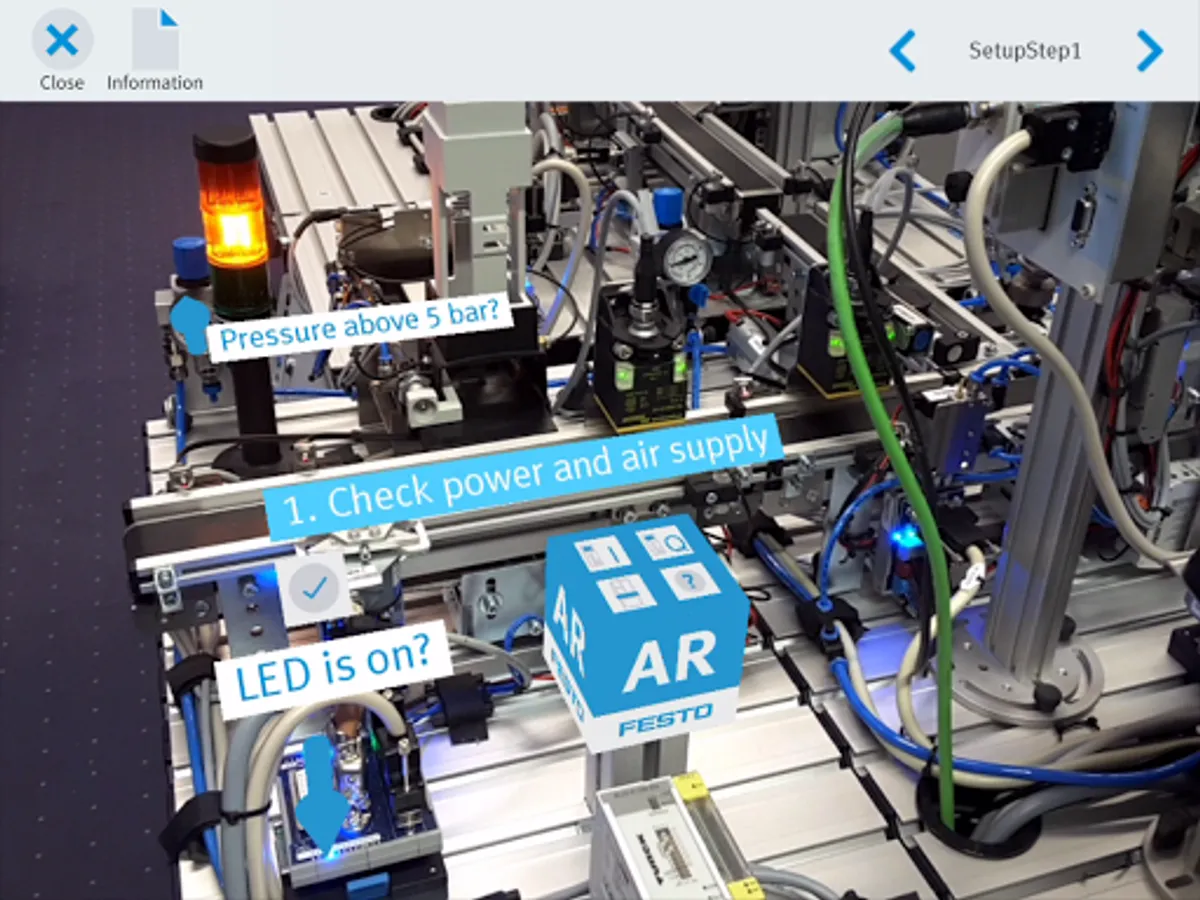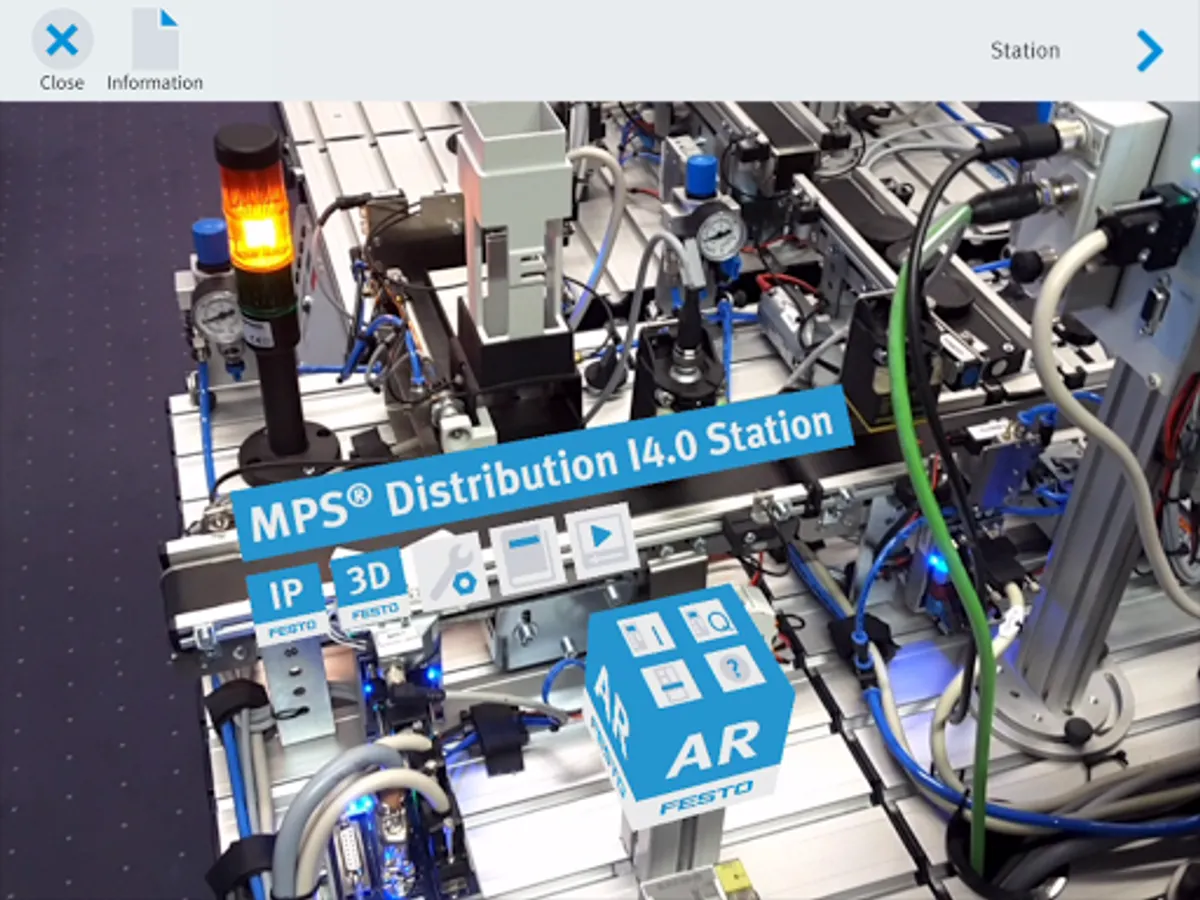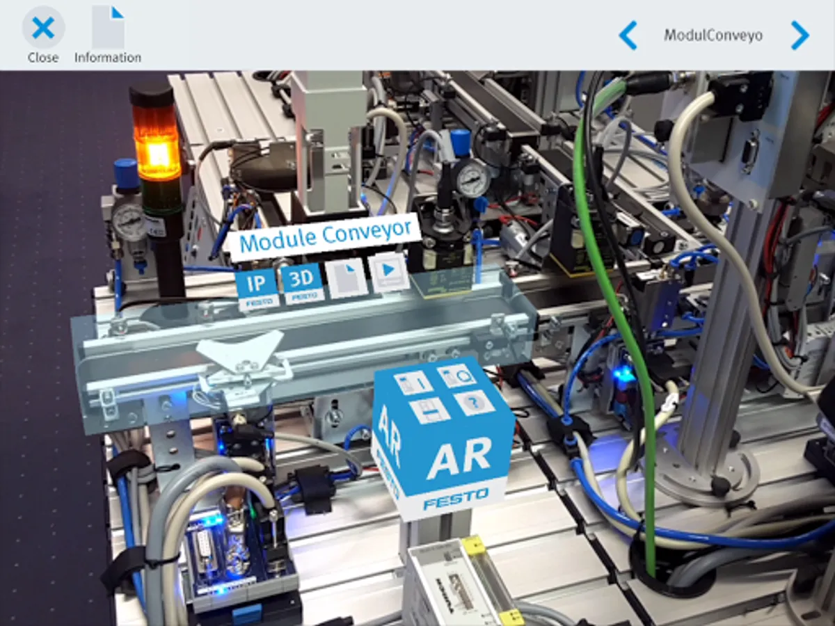 The Festo Didactic Augmented Reality App supports you to get started with your mechatronic learning system. Explore your learning system in the augmented reality with your tablet or smartphone. The AR App intuitively visualizes the layout, the control connection and the commissioning of the learning system. You can develop your own AR scenarios according to your requirements and use them in the AR App.