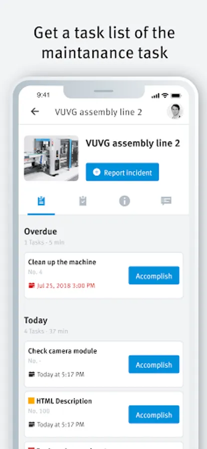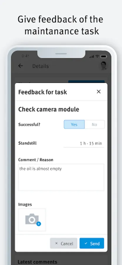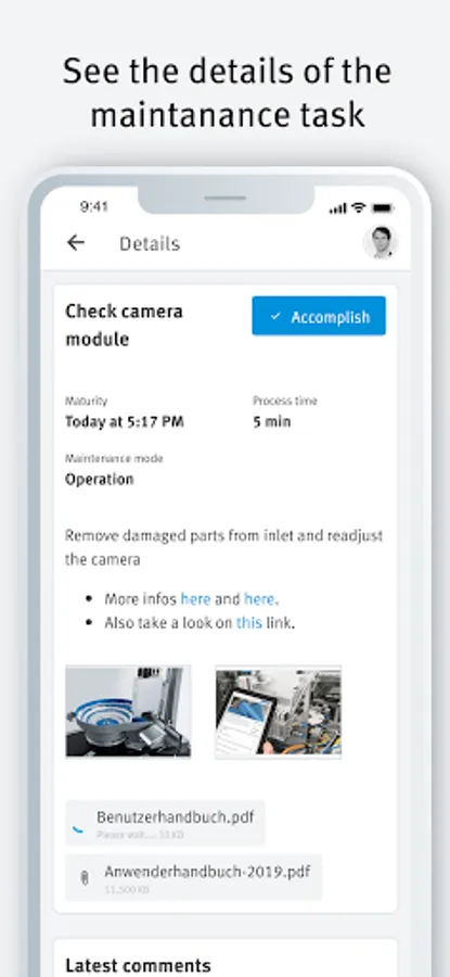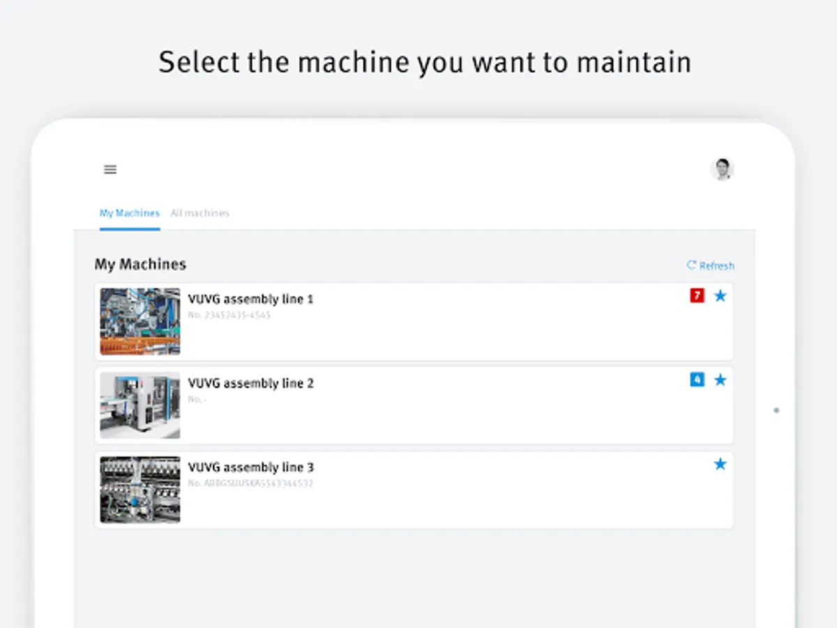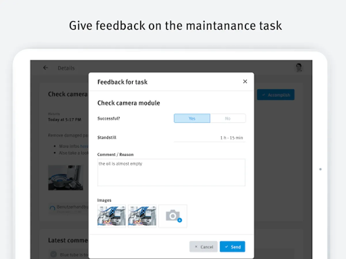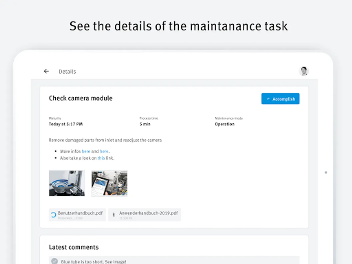 The Smartenance app allows mobile access from anywhere to your maintenance tasks, documents and other attachments. All the information you need is at your fingertips right at the machine. In addition, maintenance feedback and breakdowns can be reported directly on the spot via the app.
