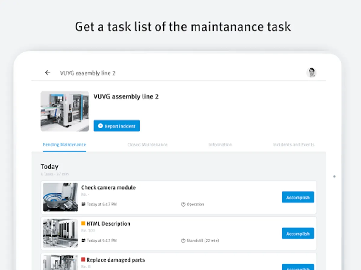 The manufacturer-independent maintenance manager Smartenance enables you to manage maintenance digitally and paperless. Maintenance tasks can be easily and flexibly scheduled via a web application and then accessed from anywhere via a mobile app. In addition, Smartenance offers you a comprehensive incident management. Breakdowns can be reported via mobile devices and enriched with images. These incident tickets are then processed and fully documented in Smartenance. Thus, Smartenance increases the efficiency of your maintenance management and is an easy and cost-effective start to digitalization.