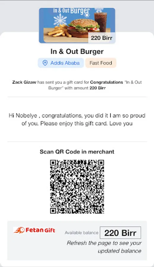 Stay in touch and keep track of your loved ones by letting them know you've been thinking of them with gift cards. Fetan Gift is a website and application that allows people to easily send digital gift cards to their loved ones and friends from different countries. This means that service providers and businesses in the country offer gift cards with different amounts of money on the Fetan Gift application. This allows your loved ones and friends to go and buy anything from the store that you have chosen for them.