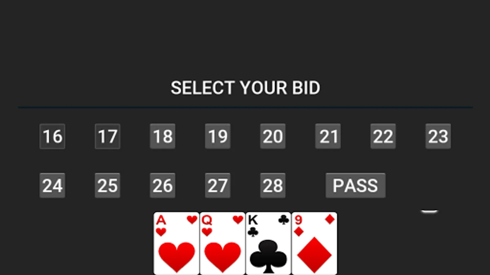 Jack (3 points), Nine (2 points), Ace (1 point) and Ten (1 point) are the only cards which have points. Thus making a total of 28 points. And Extra 1 point for last trick winner that makes a total 29 point: this total explains the name of the game. The teams need to bid and set a target for themselves and then achieve it. The player who wins the bid gets to set the trump suit thus biasing the game towards them.
