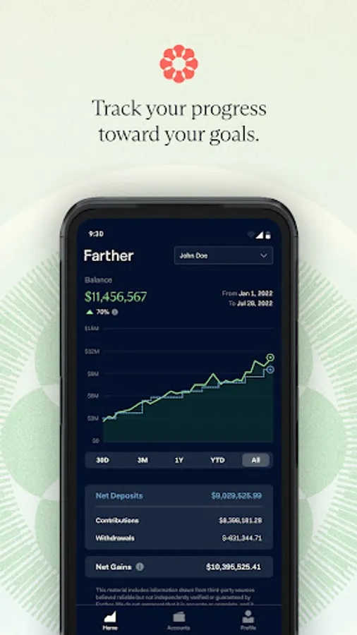 We know how hard it is to sit in the driver’s seat on your financial journey. Our modern interface makes it easier to achieve the visibility you need to maintain control of your finances by offering a holistic view of your financial life. Coupled with powerful advisory tools and access to support when and where you need it most, Farther is designed to be your co-pilot — to help you go farther, faster.