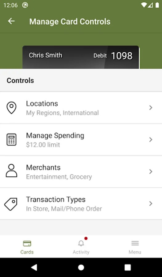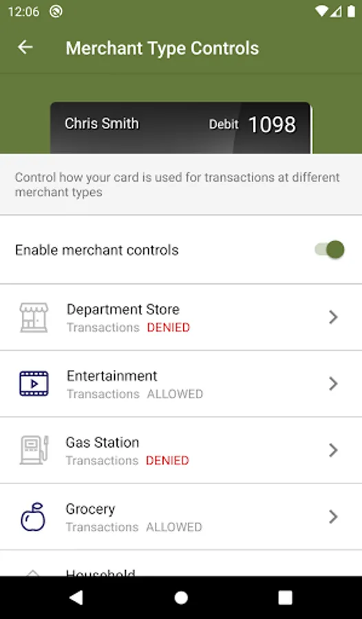 Spending limits can be established to allow transactions up to a certain dollar value and decline transactions when amounts exceed your defined thresholds. Transactions can be monitored and managed for specific merchant categories such as gas stations, department stores, restaurants entertainment, travel, and groceries. And your transactions can also be monitored for specific transaction types: in-store purchases, e-commerce transactions, mail/phone orders and ATM transactions.