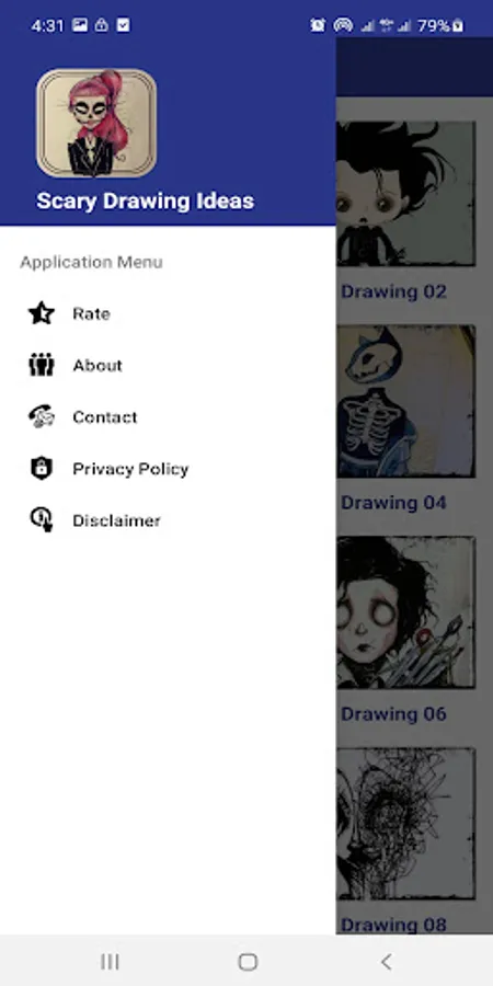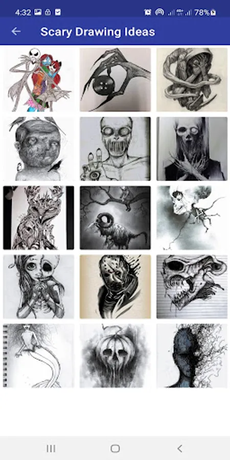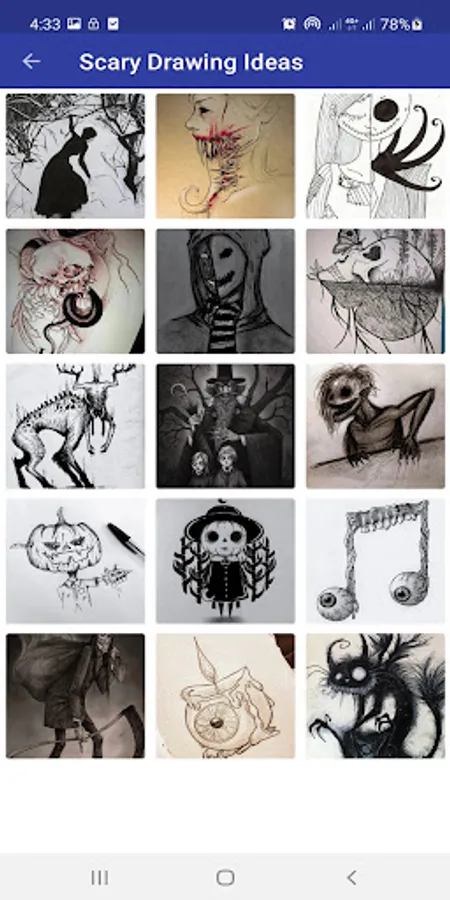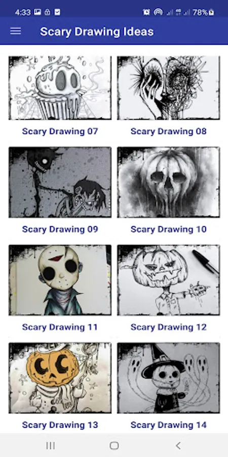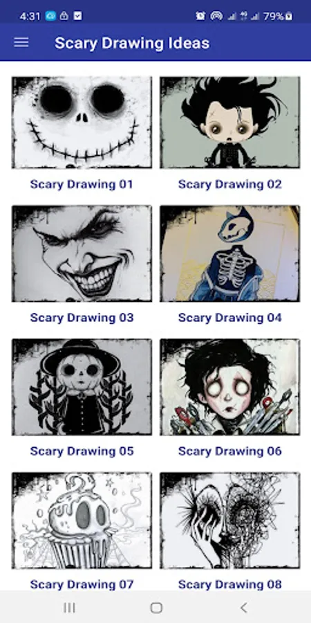 This app "Scary Drawing Ideas" is a simple to use. It can be a useful help for you to get many inspiration to draw horror characters. Once you downloaded this free app, you will find lots of easy drawing ideas such as: