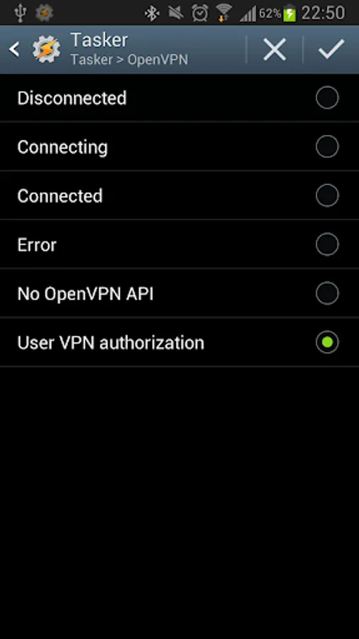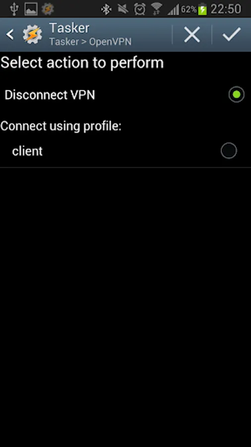 The OpenVPN Tasker Plugin is a Tasker plugin that integrates with the OpenVPN for Android App to provide VPN tunnel state information (including when the Android VPN Authorization dialog is shown) to Tasker as well as allowing Tasker to initiate (and disconnect) VPN connections.