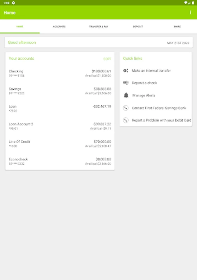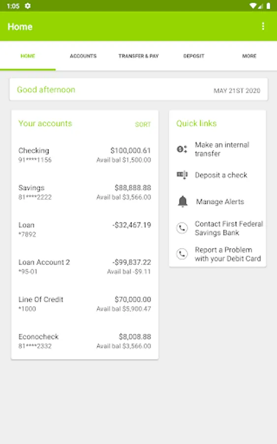 - deposit checks (This feature requires additional set-up; please download the app and contact First Federal Savings Bank, at 217-356-2265, for access.)