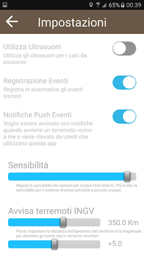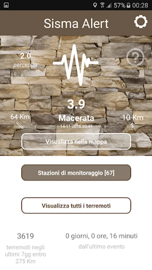 Rich with many features such as the ability to activate an ultrasonic frequency signal audible to animals and rescue dogs. In the home screen you can also view both the magnitude of the earthquake epicenter, it is the one actually perceived in the area where you are using the attenuation equations of seismic waves based on the distance from the epicenter.