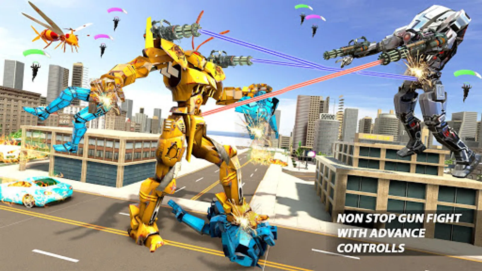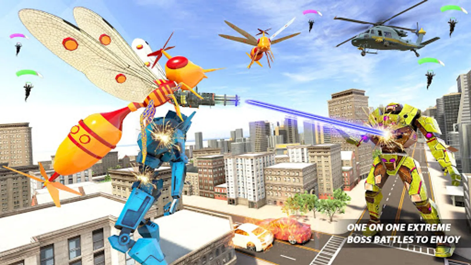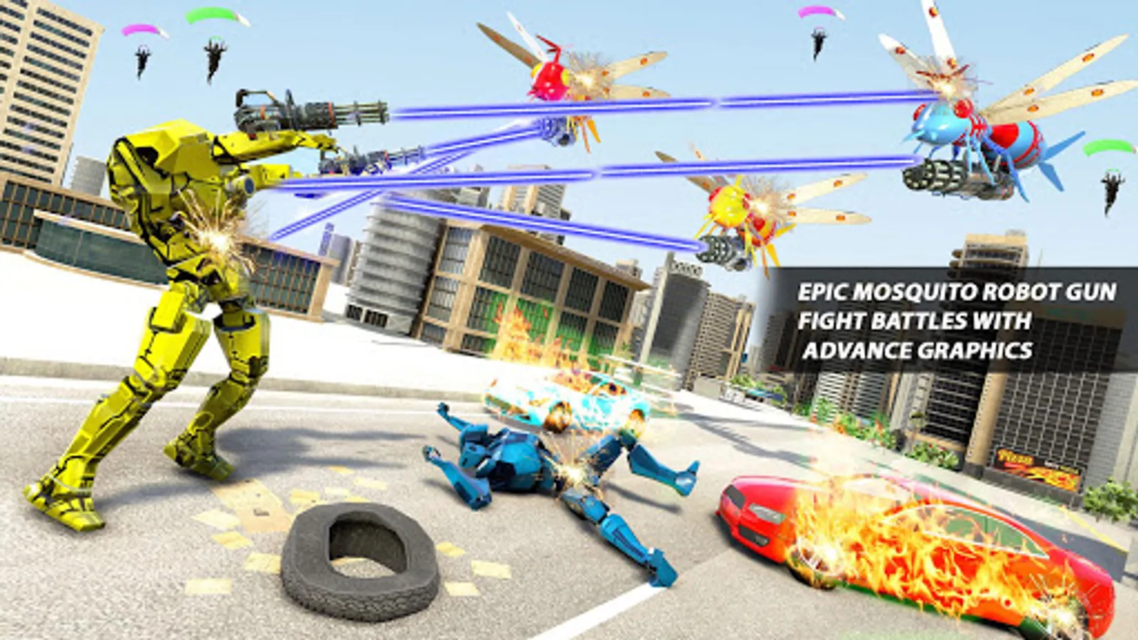 Robot mosquito transform: flying bee shooting transform into futuristic robot to get down super robot battle and defend city battle from evil robots in flying insect robot transforming games. When you enter into this flying robot games, its very difficult for you to keep under control as the condition will demand your presence evaluate robot battle games. Flying mosquito robot war: transform robot games or flying mosquito robot simulator is now new trend in robot transform games where future robot to wants to humiliate country peace. Robot simulator is a mech warrior and robot mosquito warrior to justify robot attack in robot mosquito flying games.