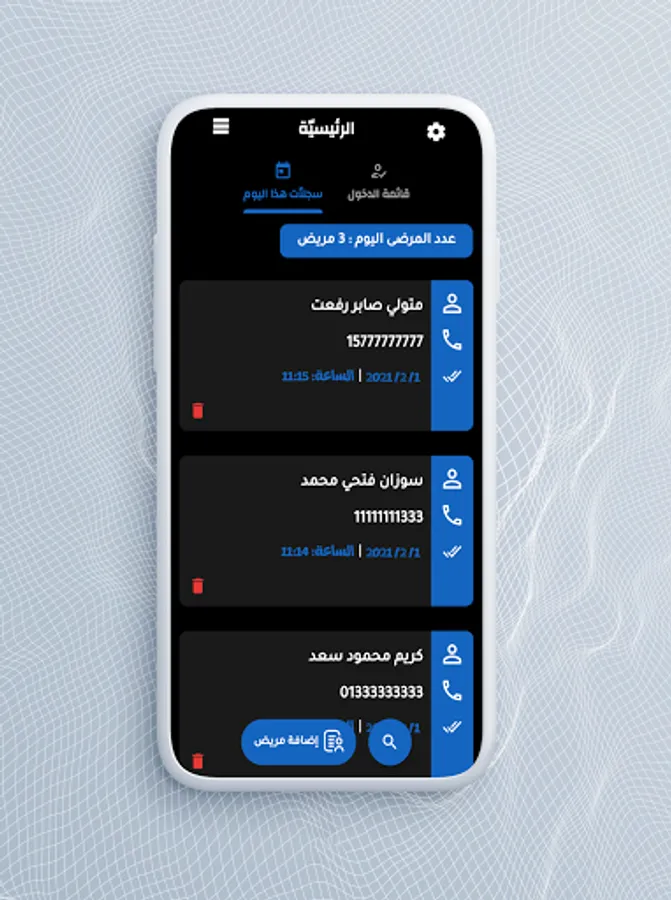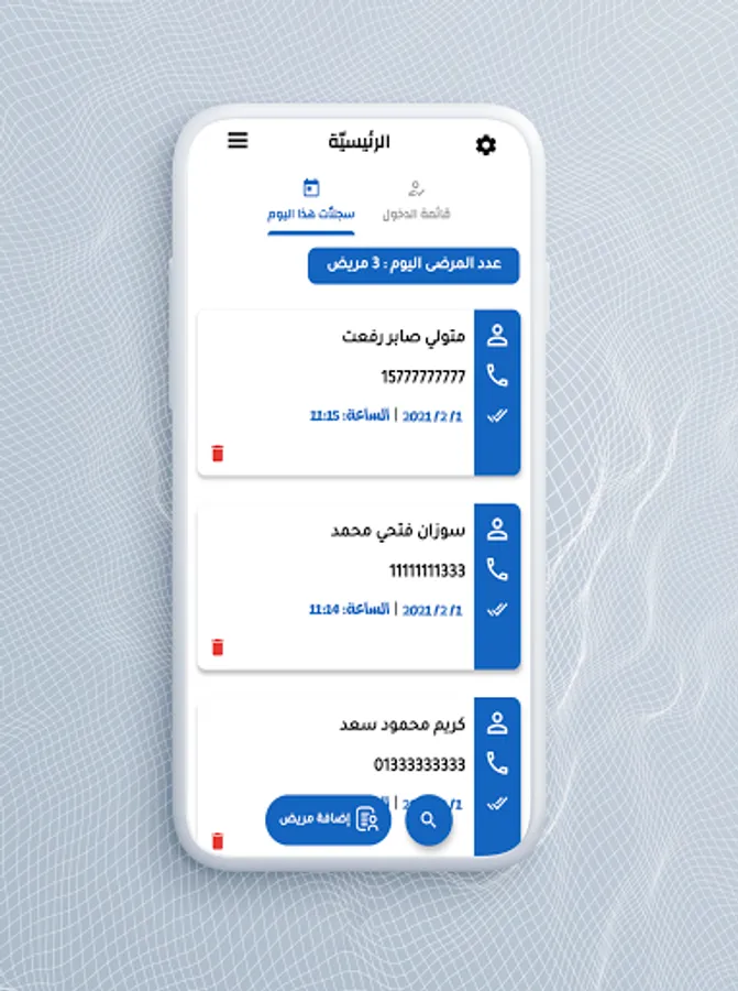 * البحث عن المريض من خلال رقم الهاتف لسرعة الوصول إالى ملفه والتعديل عليه.