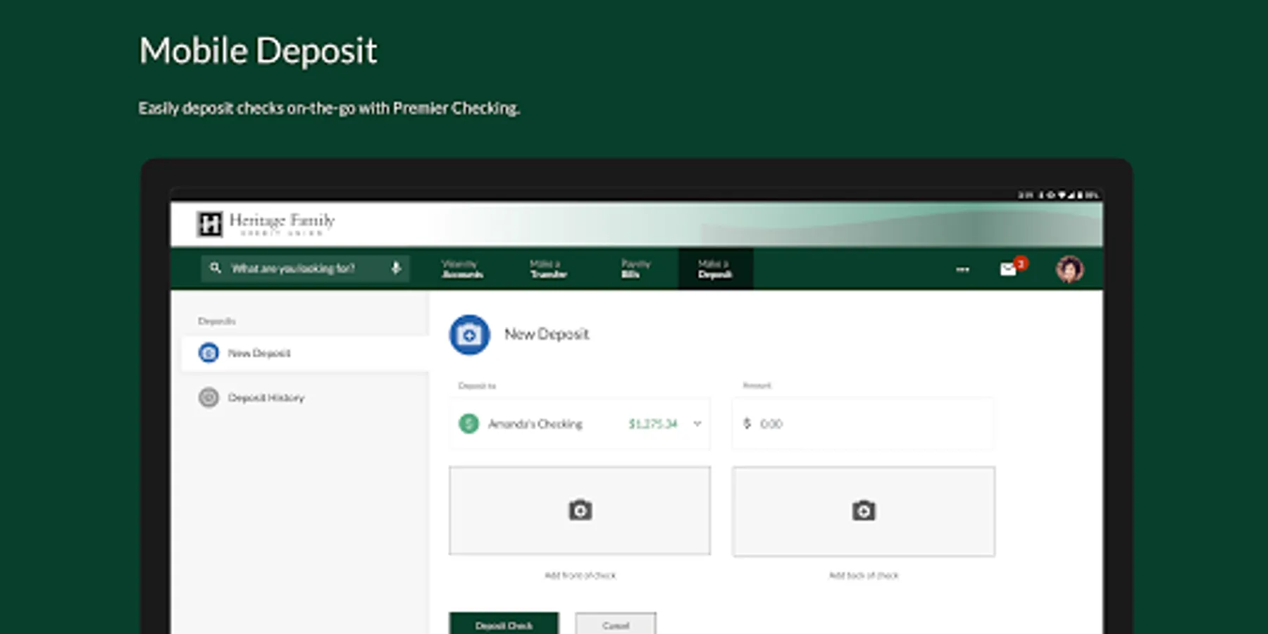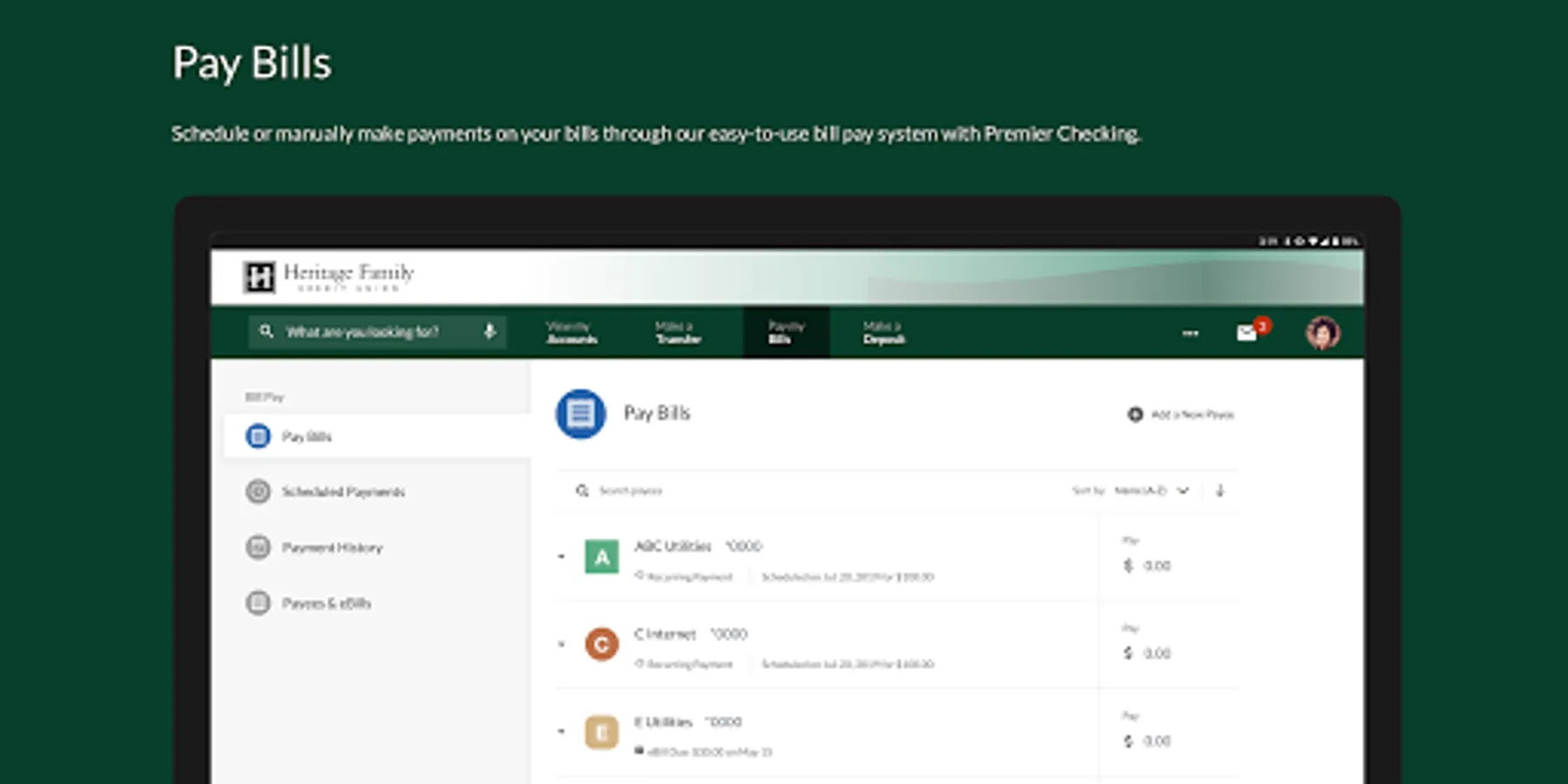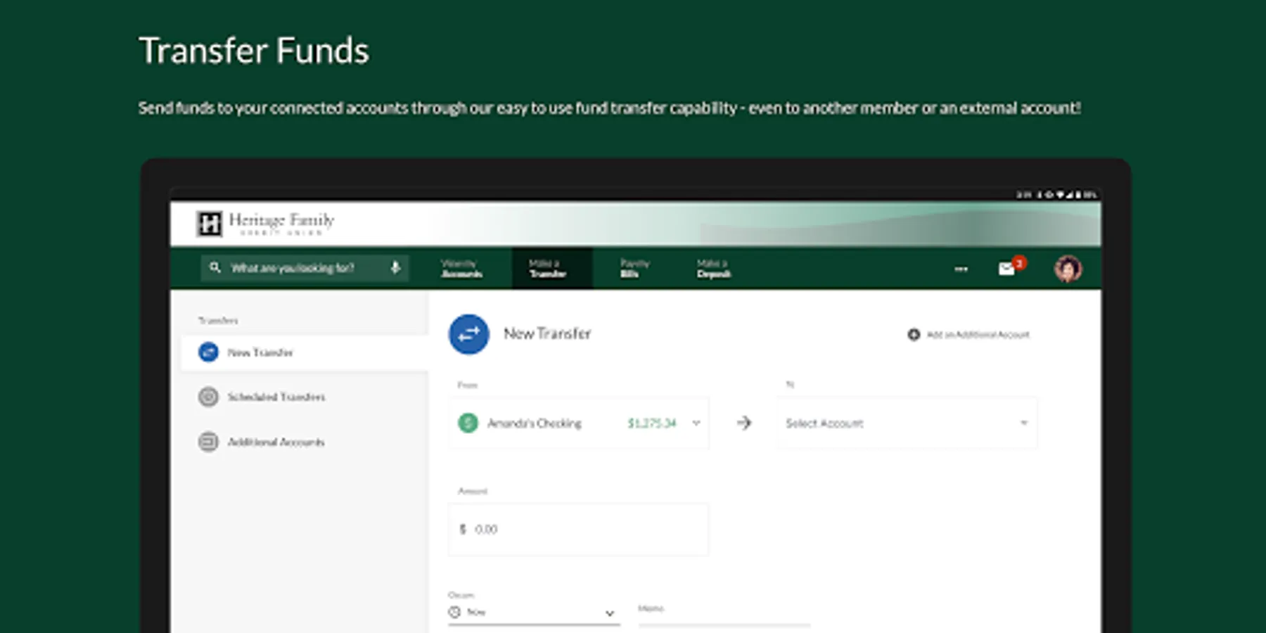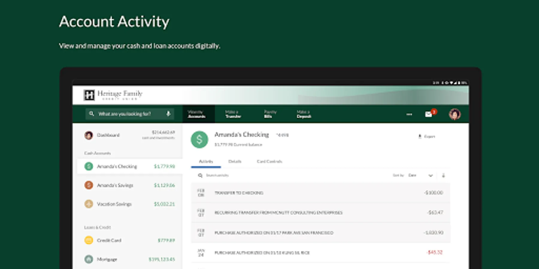 Manage your Heritage Family Credit Union accounts securely and conveniently from anywhere using the Heritage Family Credit Union eBranch app! You can check your balances, schedule a payment, make a transfer, set alerts and so much more using the HFCU eBranch app!