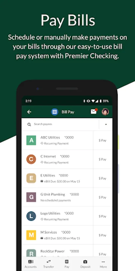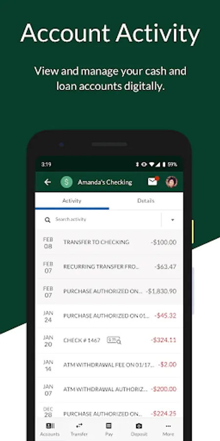 Accounts: View and manage you cash and loan accounts digitally. Review recent transactions, see current balances, and search for specific payments or deposits.