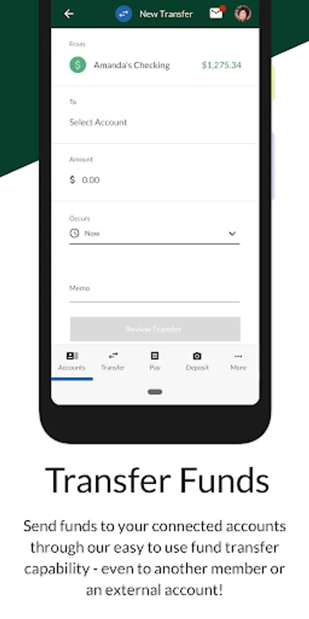 Transfers: Send funds to your connected accounts through our easy to use fund transfer capability. You can even transfer funds member-to-member or to an external account!
