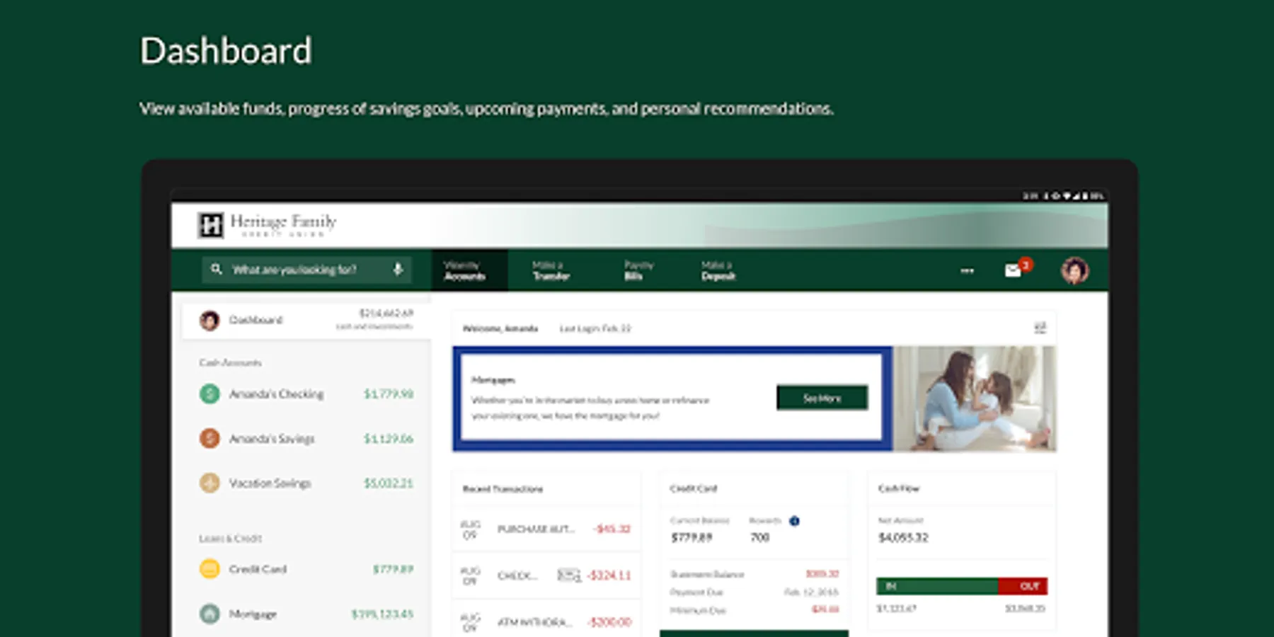 Dashboard: Manage your account in one easy to view dashboard. View available funds, progress of savings goals, upcoming payments, and personal recommendations all in one simple and easy to read screen.
