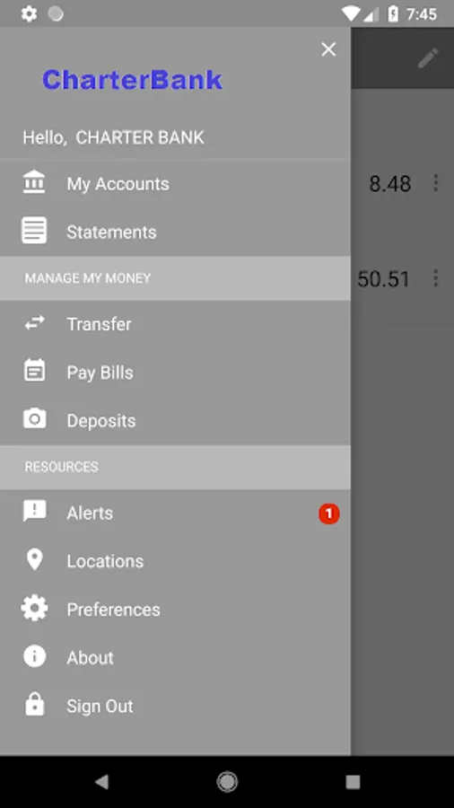 Charter Bank Mobile Banking supports all account types, including Checking, Savings, Money Market, Certificate of Deposits, and Loans.