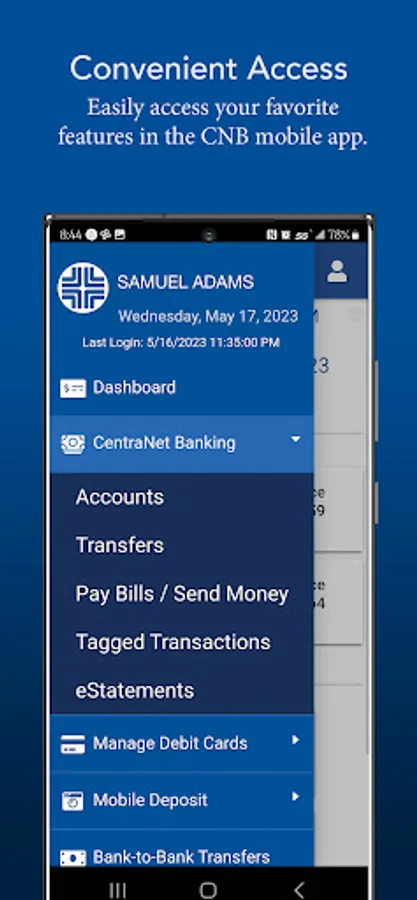 Central National Bank's Mobile CentraNet provides real-time access to your accounts via your smart phone. You can view your account balances and recent transactions, transfer funds, and pay bills anytime, anywhere. There is no fee for this service from Central National Bank. Connectivity and usage rates may apply. Contact your wireless provider for more details.