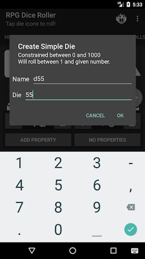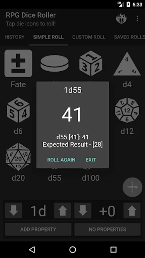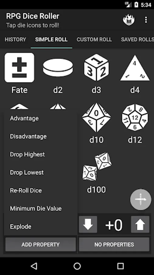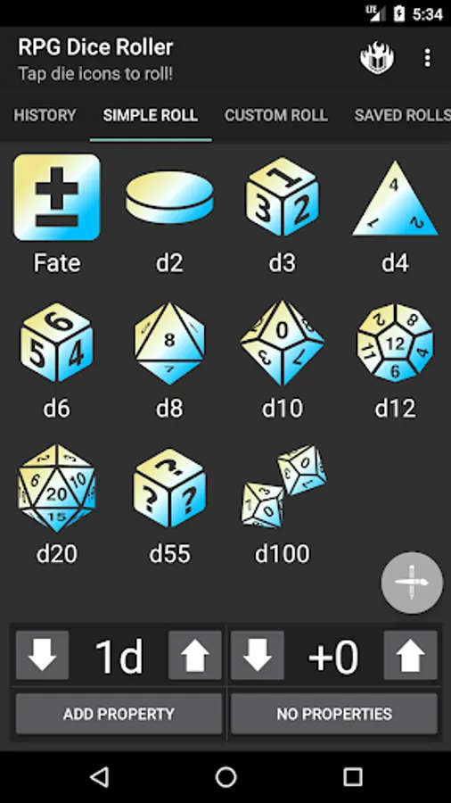 - Standard dice array: Fate, d2, d3, d4, d6, d8, d10, d12, d20, and d100