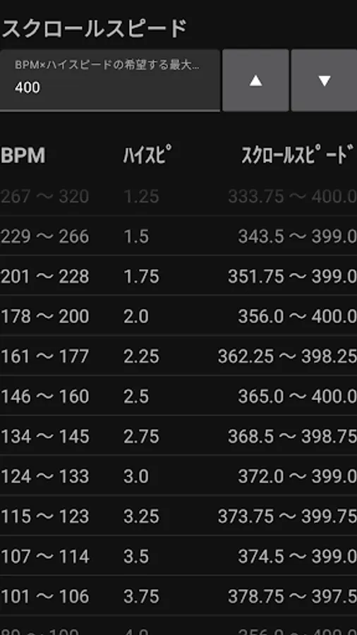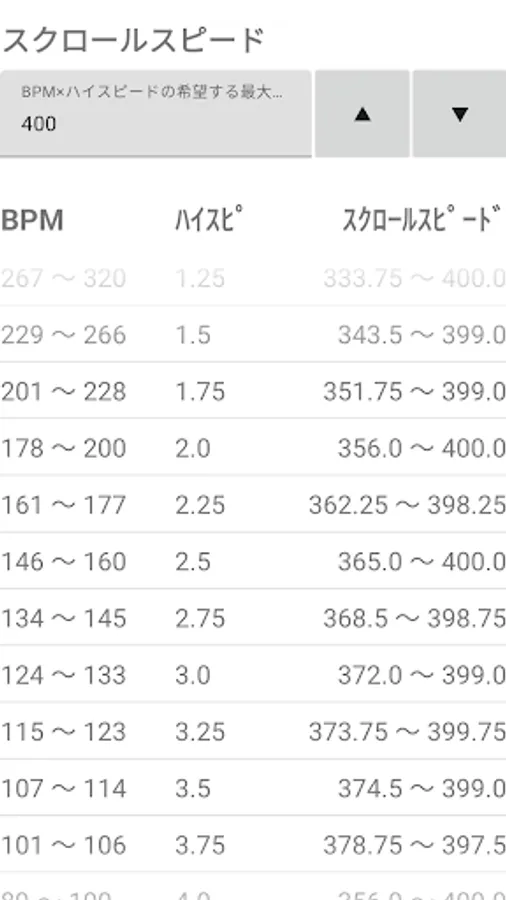 By setting the maximum scroll speed (= BPM x high speed) that you can recognize in the input field, the appropriate high speed setting for each BPM band and the scroll speed in that case will be listed.