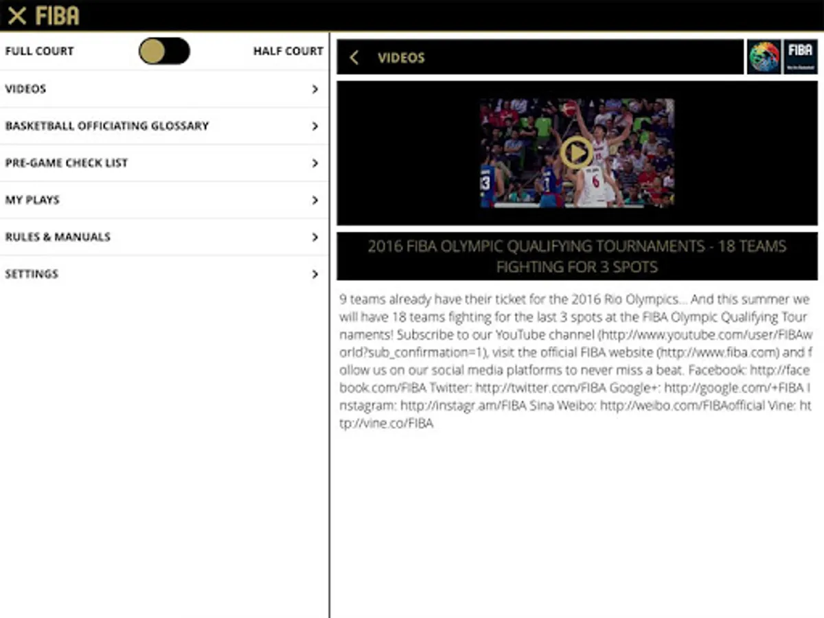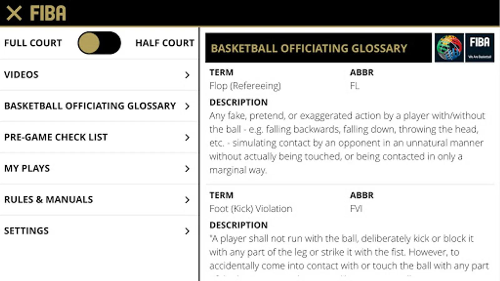Includes videos, basketball officiating glossary, pre-game checklist with designated groups for officiating, technical manuals, FIBA basketball rules and official interpretations (OBRI), full & half court with referees, players, coverage area symbols, drawing tool, able to save your own play-situations.