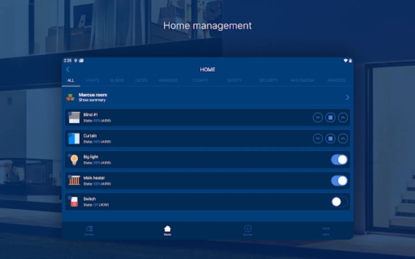 The new app is equipped with an intuitive dashboard designed to every last detail. After switching the app on, you can immediately see the Home Summary displaying everything you need to know about your home with just one glimpse. Monitor the state of the alarm, temperature, lighting, doors and windows, blinds and gates, switches and many more depending on your preferences.